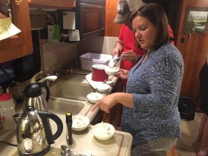 Susan has her mother’s hand written recipe handed down from one lunch pail to the next over generations. We follow this, the Gospel of Pie, almost exactly. We leave out the suet (the birds get it) and to make them a bit more heart healthy, we leave out the lard. We added some of our own decorative embellishments and baked up a batch to share in the convection/microwave oven in the coach. It really smelled good.
