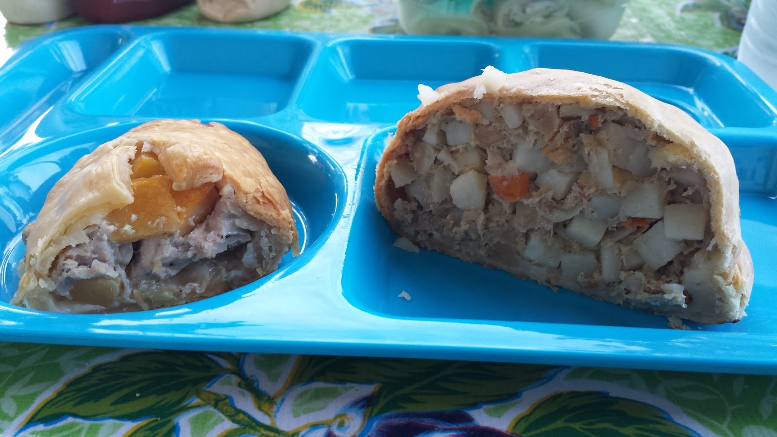 | The True Pasty with Flakey Crust, Beef and Pork on the Left Or Muldoon’s With Ground Meat and Carrots On the Right (no idea what the red thing is) |