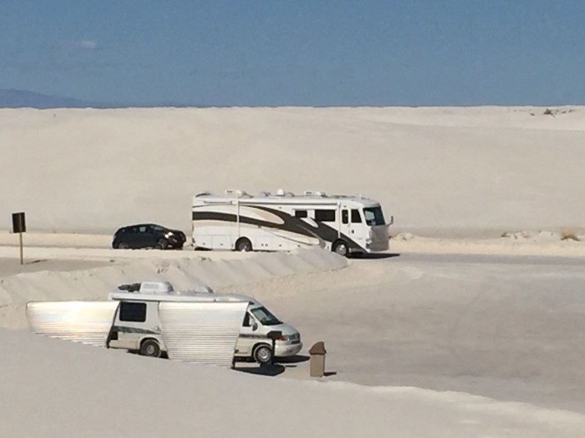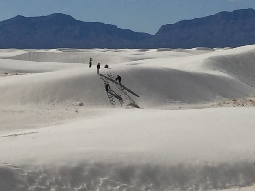 The wind blows the gypsum sand into many different shaped dunes. Since the gypsum is water soluable if it gets wet it can form a firm layer on the surface of the dunes. And since it does not absorb the sun’s radiant energy like normal sand it remains cool enought to walk on in your bare feet even on the hottest days.