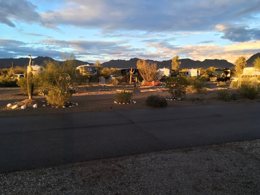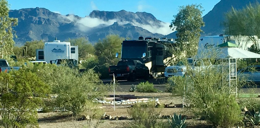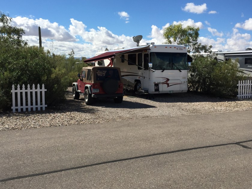 We left Deming in a strong wind from the SW. The road to Tucson heads west and then north and downhill towards Tucson. The wind direction changed to more southerly direction. That gave us downhill and a tailwind and 16 mpg for a couple of hours. We were heading for an area SW of Tucson and an RV park we have been to before, Justin’s Diamond J. It really is a pretty nice park. It is adjacent to the Tucson Mountain Desert Park, a huge desert park with trails all over. It is not far from Saguaro National Park, the Arizona Sonoran Desert Museum (sort of an arboretum/zoo) and several other tourist attractions … none of which we went to.