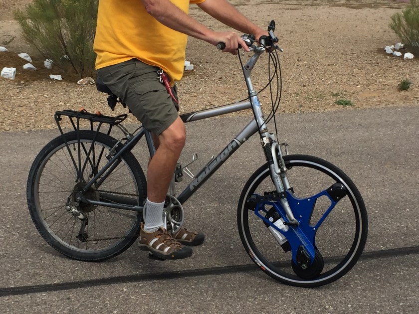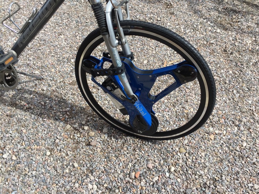Susan and I ordered electric bike wheels for our bikes. They are easy to put on, just take off the existing front wheel and replace it with the electric wheel. It takes about a minute. They have an electric motor, a substantial Lithium Ion battery and a throttle. You can ride the bike with no electric assist or coast to a stop or down a hill and the battery recharges. If you want the electic wheel to help or do all of the work you just press on the throttle.