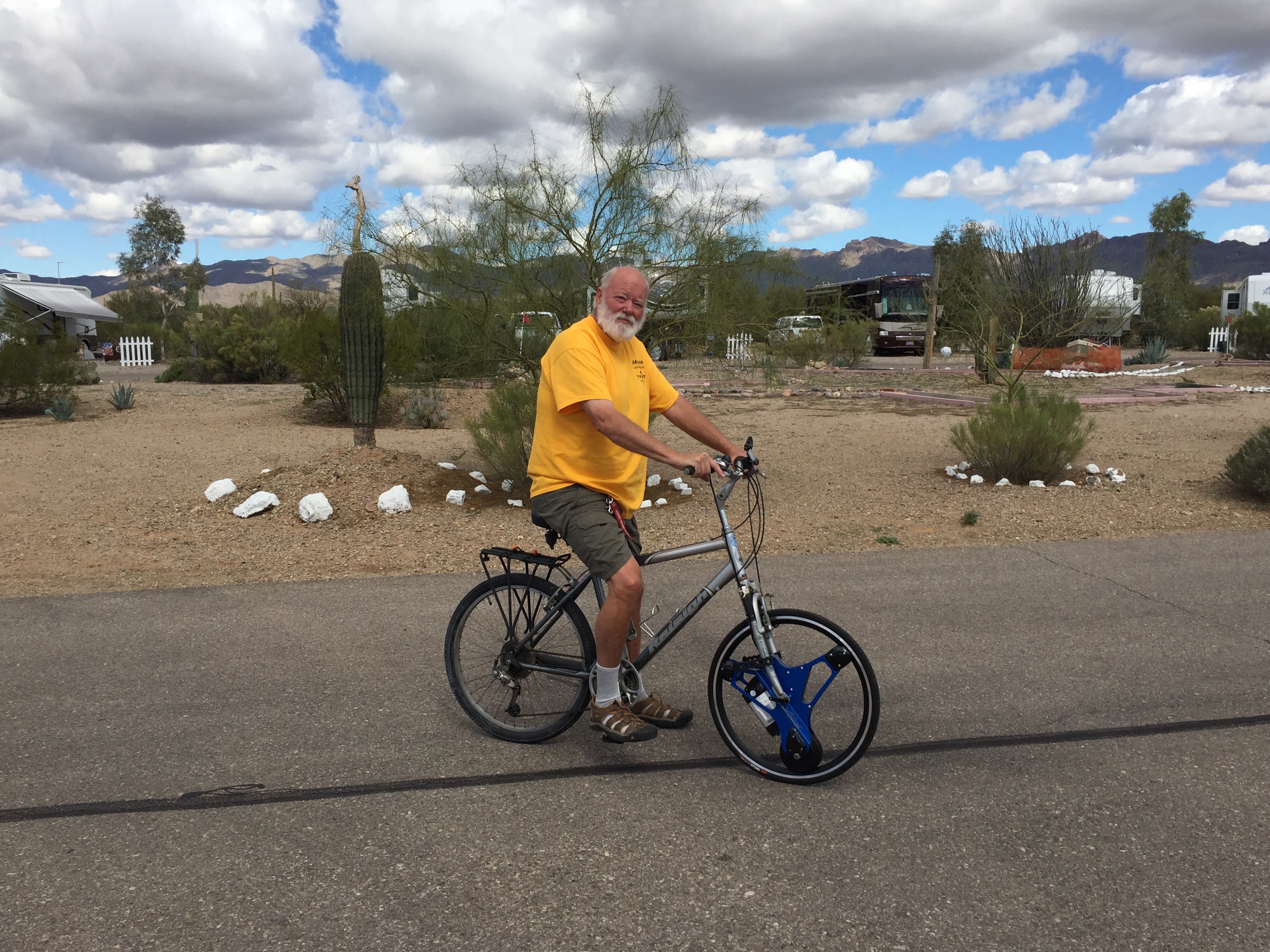 These are great fun. Our goal was to just ride more and more often. If these help do that then great. Our friends Kent and Peggy Speers were also at Diamond J’s. They have electric bikes too so one day we loaded them on the bike racks and went to a bike trail head in Tucson. Tucson has hundreds of miles of bike trails through the city. The one we were on followed a river (dry). We rode a little over 10 miles out and back. Susan used her battery quite a bit but it still had charge left. I used mine less so I had more. Kent and I had a drag race. We hit 19.6 mph.