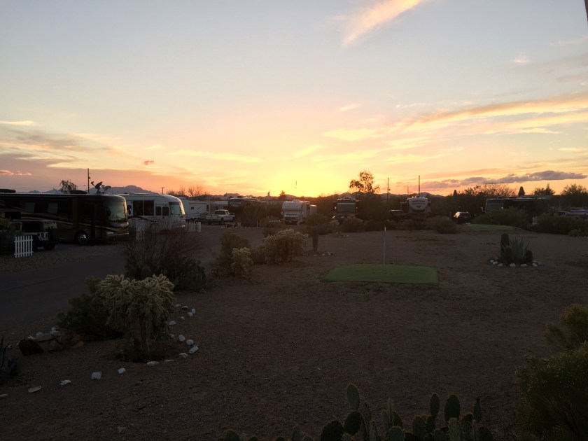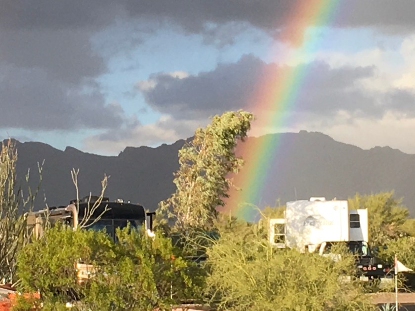 Back at the campground we got an occasional sprinkle of rain followed by sun and almost always a rainbow. It looks so close.