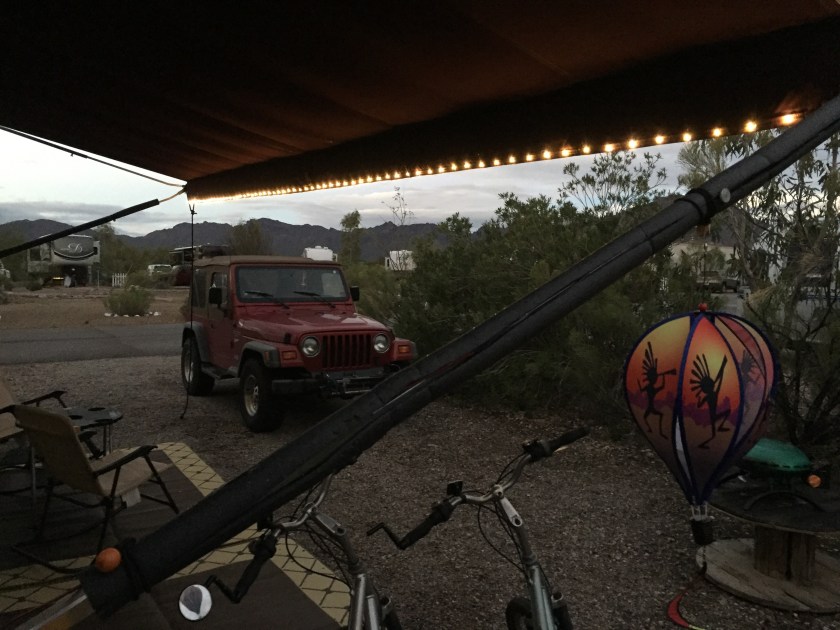 These looked good. The coach actually has underbody lighting as well. Not as garish as rope lights. We liked the way this looked so we got another string that was dimmable. That string was too white. So a third string finally had both the color and dimmable features we wanted. These are about $9 each so trying a couple out to get the right one wasn’t a big deal. The final version is actually sewn onto the inside of the awning flap along one of the stitching lines. If it is off you can hardly see it. The power cord disconnects at the flap edge and the lights roll up inside of the awning when it is stowed. Neat!