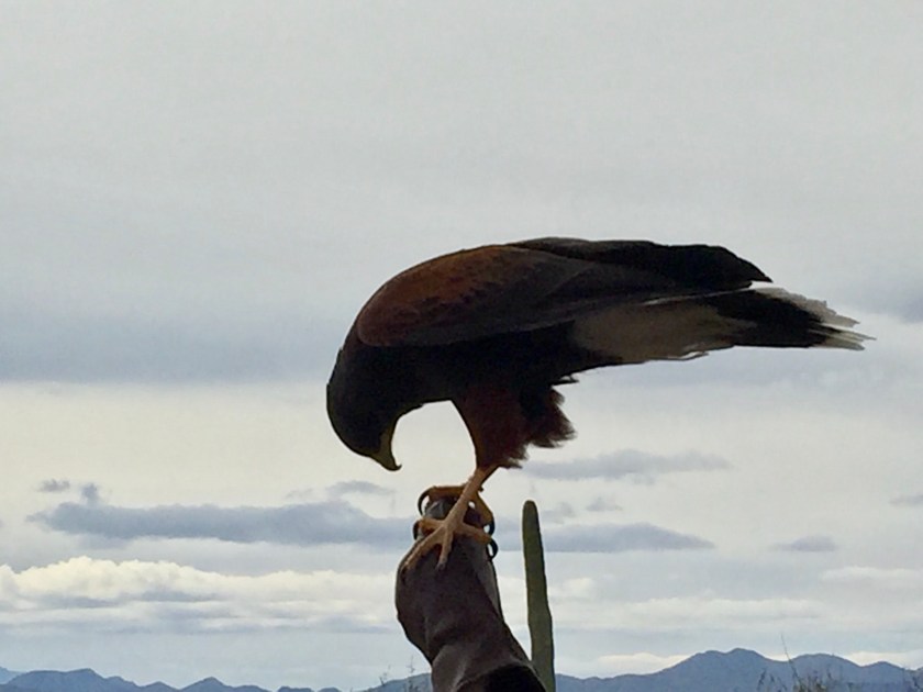 And a Harris Hawk perched on a gloved hand of a handler. These hawks live in family groups and hunt for prey as a group. That is a very uncommon behavior for birds.