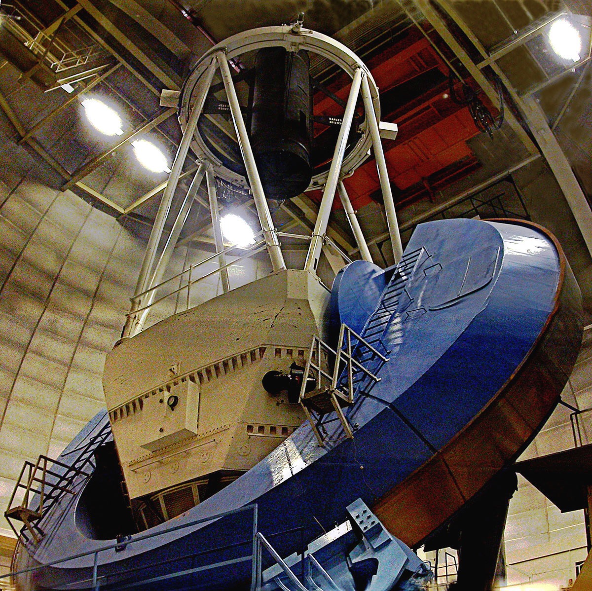 It was quite cool (temp) inside. The big blue ring holds the yellow reflector. Both rotate to aim at the desired object in the night sky. All of this is highly automated today. In 1960, not so much. This is a very busy telescope in use almost every night. The scientists who are using the telescope stay in dormitories on the mountain sleeping during the day and working at night. Time on this telescope is scheduled out for years in the future.