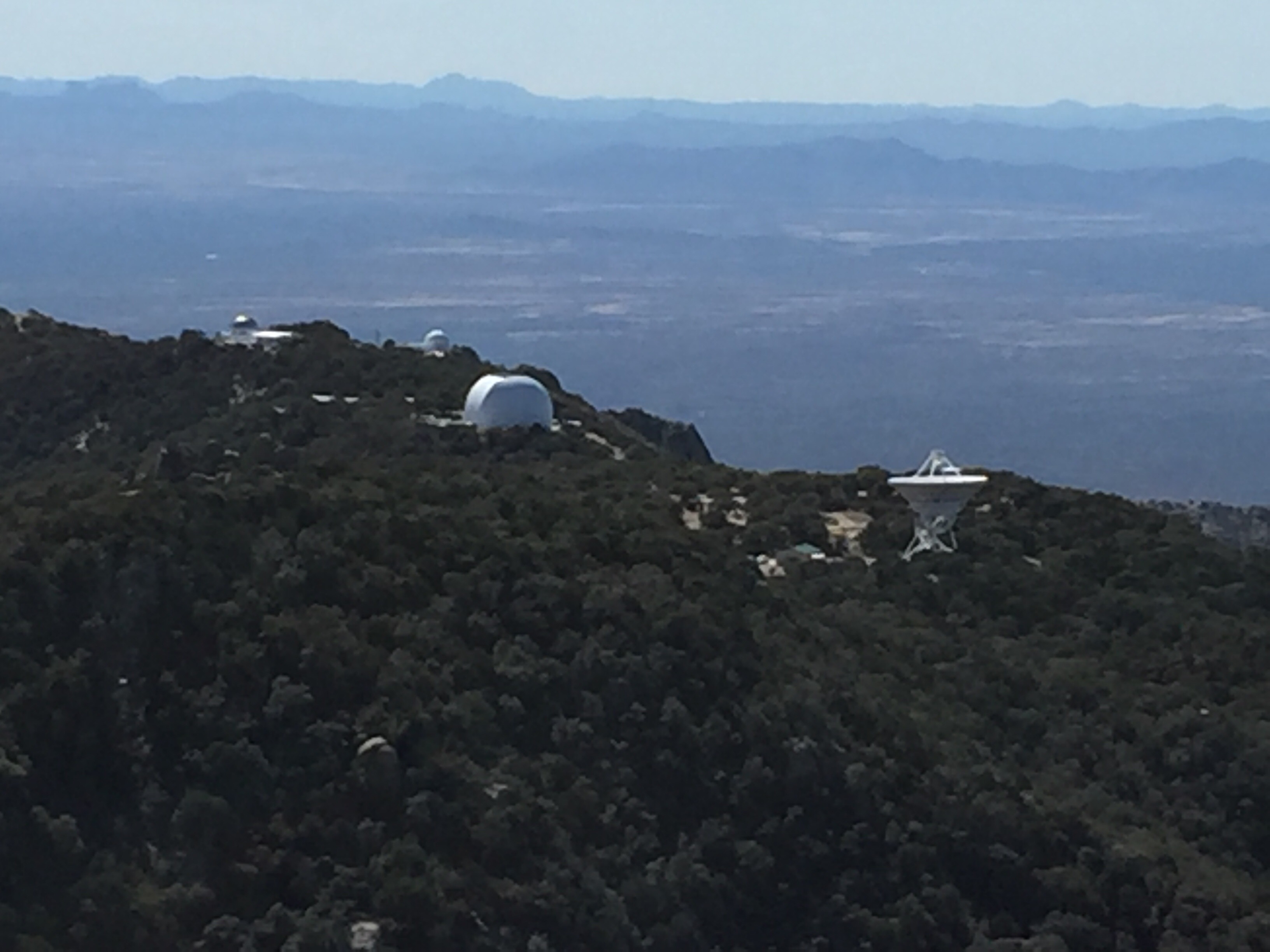 The radio telescope on the right is part of a string of radio telescopes several thousand miles long that are all coordinated to point at the same place in space at the same time. Looking west, you could see a long way from up here.