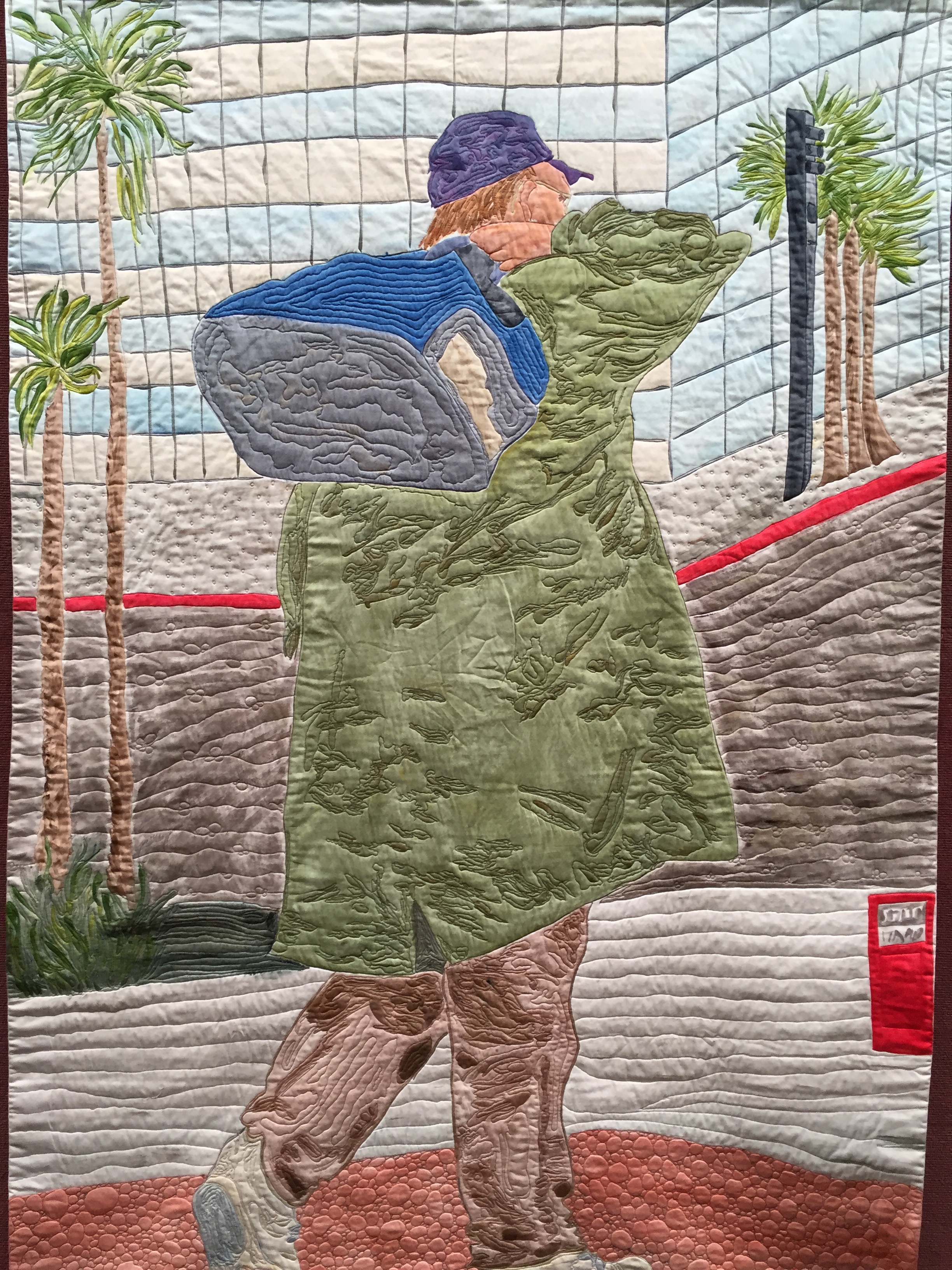 We also went to the Tucson Jewish Community Center to see a quilt show. These were all done by a woman whose focus was on homeless people. Her own son was a homeless person that she could not find. The quilts were cotton, hand painted with fiber reactive dyes and then quilted. None of the quilts showed any facial features. Nameless, faceless, homeless.