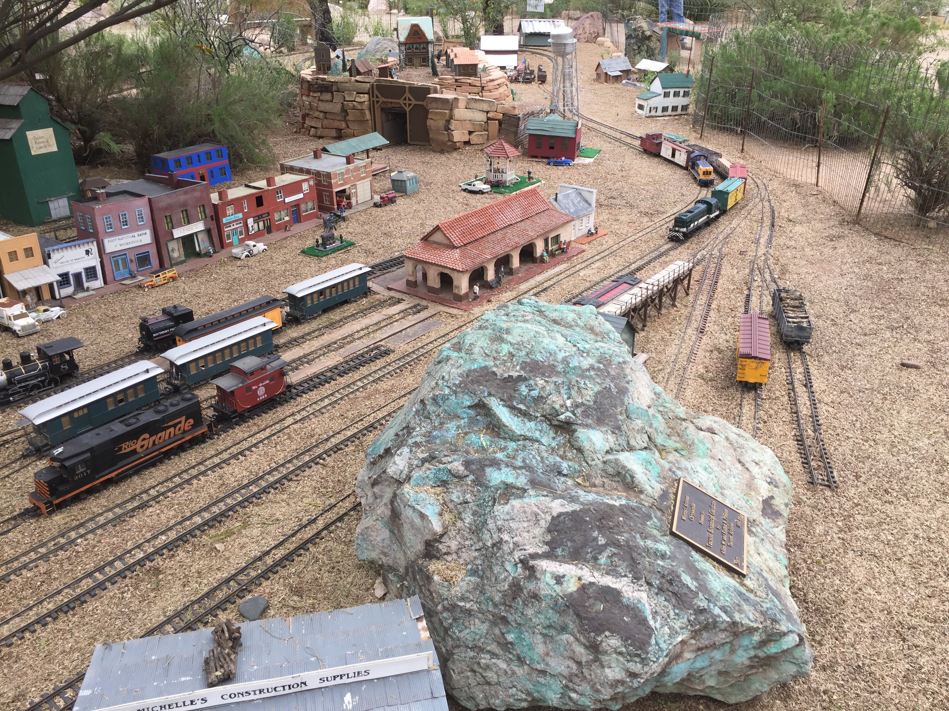 The Tucson Garden Railroad Club has a model railroad here. There are many outdoor garden railroads in Tucson. A sign gave a schedule of tours of these railroads. This was pretty detailed and the trains were running.