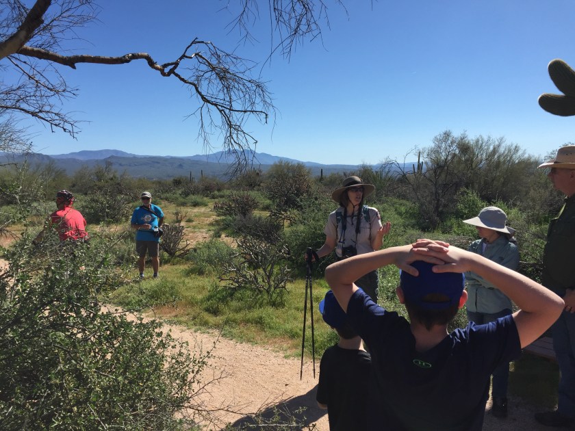 Amy knew the names of just about every native plant and quite a bit about how each plant was important in the desert environment, to the Native Americans and to those who followed them. She also talked about the Saguaro Cactus in the area and how long it took them to grow. She showed us very small ones, less than a foot tall, growing in the protection of a bigger bush. At a foot tall a young Saguaro might be 5-10 years old.