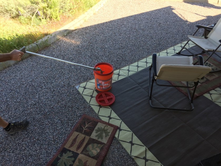 One of the campground hosts was going by and Susan waved at him. He came over for a look and called John, the other campground host, who came over with his 6′ long snake grabber and a snake bucket. By the time John got there the snake had calmed down and crawled under the coach. Without too much drama, John grabbed the snake, it was about three feet long but looked at least six in our wide-eyed view, and put it in the bucket and screwed on the lid. They took it somewhere not too far away and let it go. The campground hosts get training for all of this. John said they had picked up three in the week leading up to this one. And since the snakes have a pretty small territorial range they only take then a mile or two away to release them.