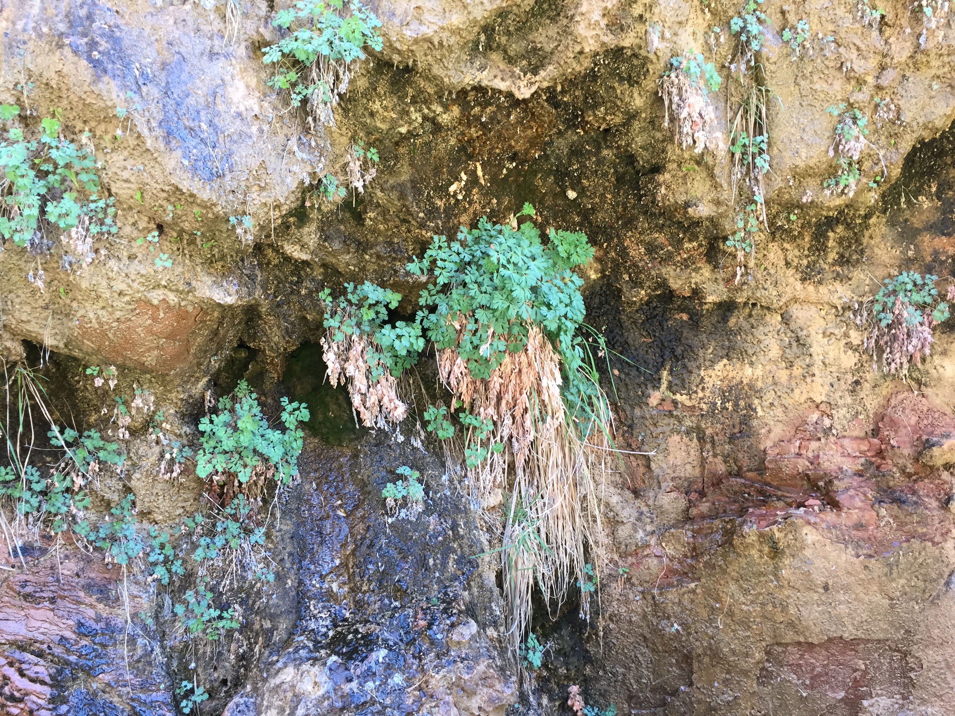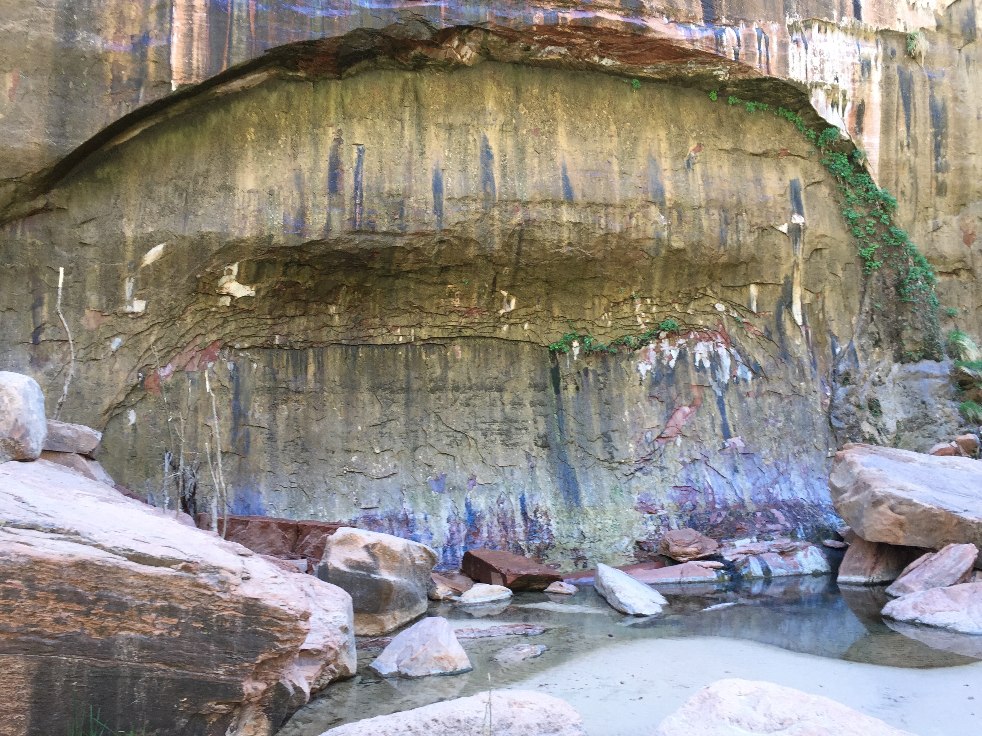 And in many shady side walls water would just ooze or bubble out, dribbling down the face and form small pools. The different colors are all the result of minerals being disolved by the water and then deposited on the face of the rock as the water flows down.