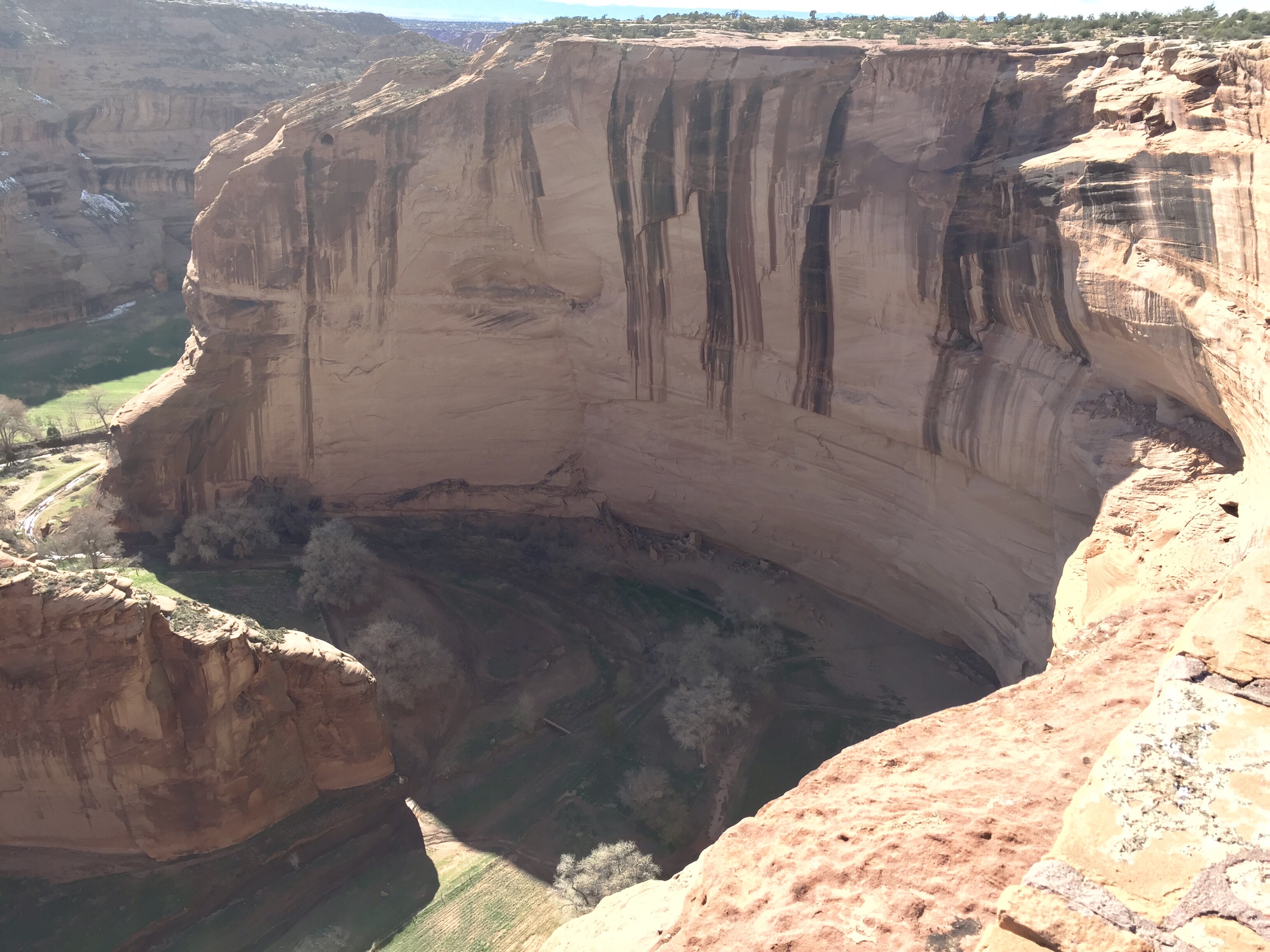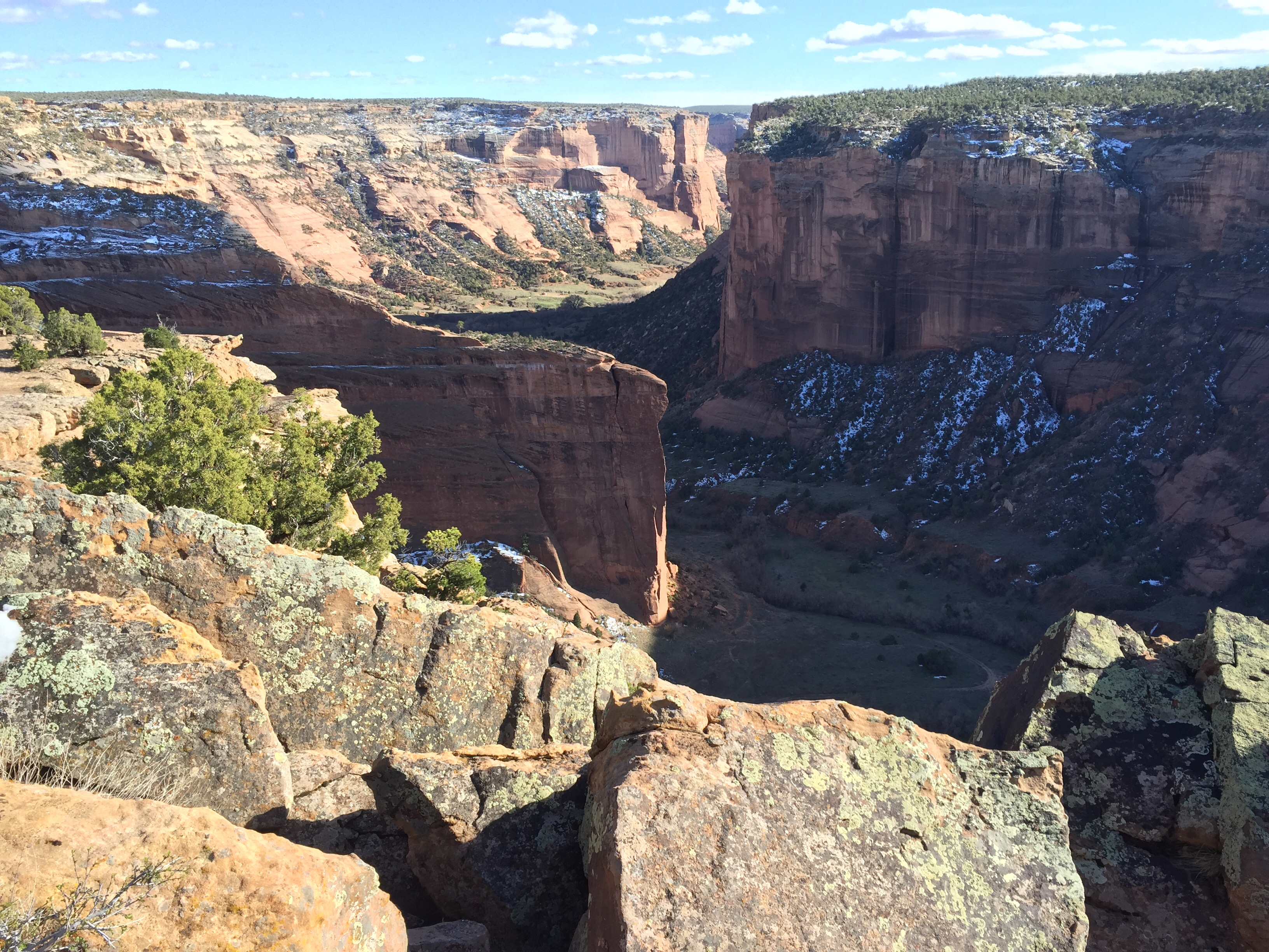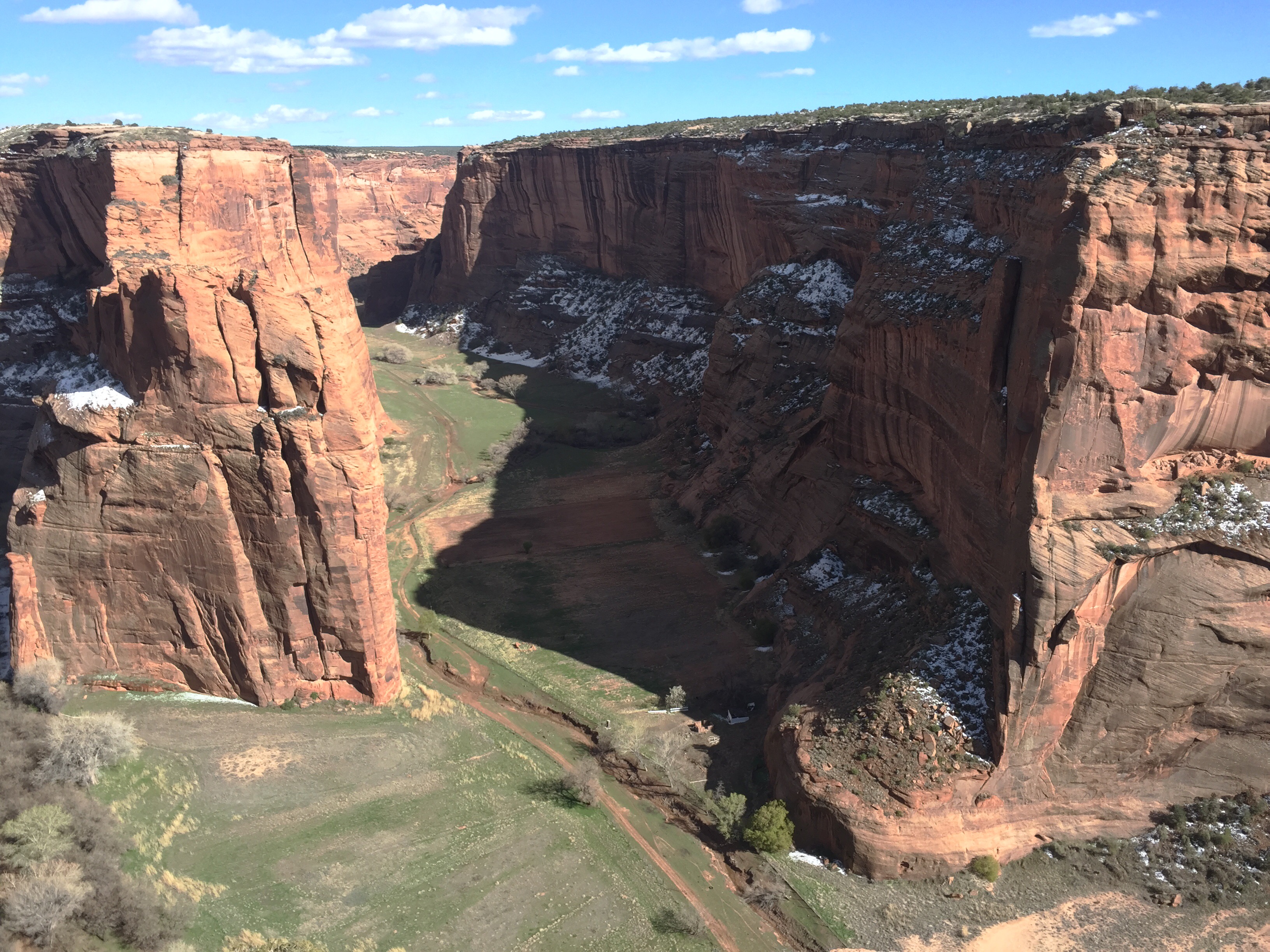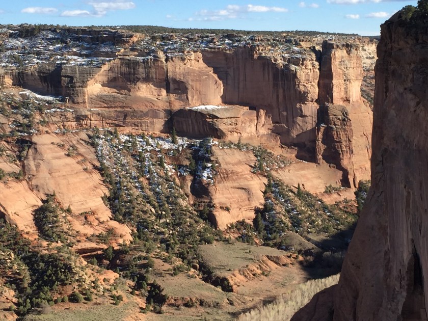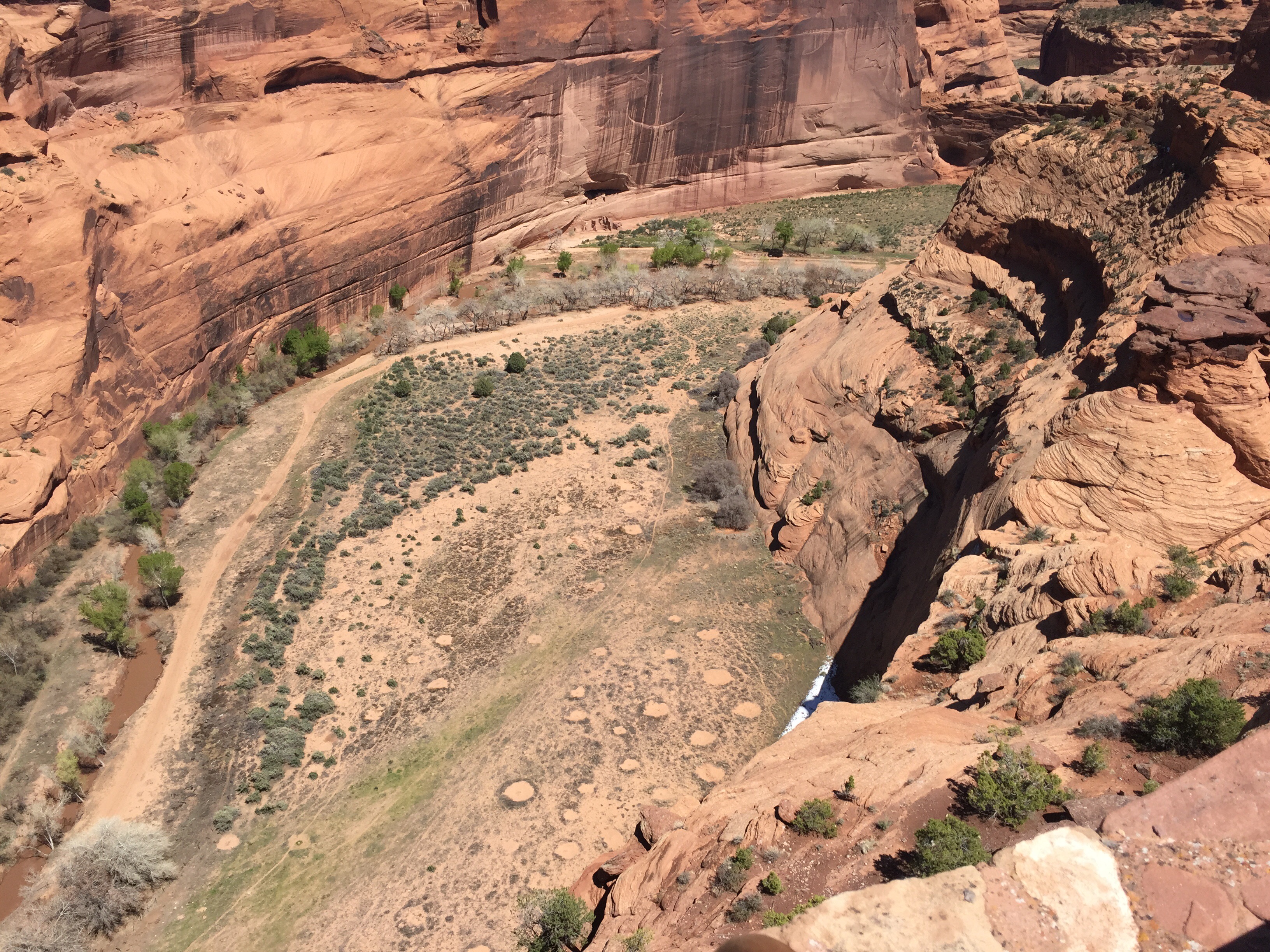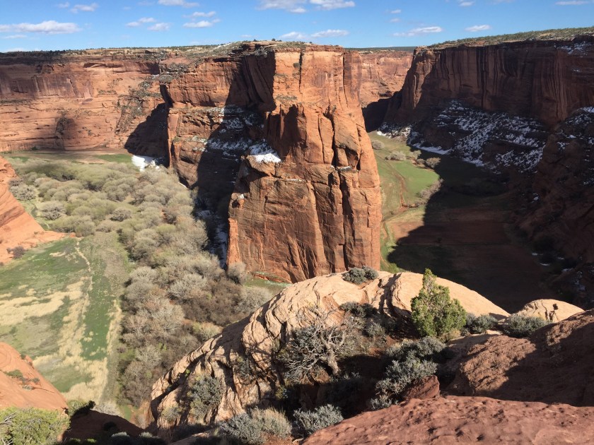It was cold here at night, about 7,000 ft elevation. Snow still in any shady areas. There are roads in the canyons and fields. The Chinle Creek runs all year long.