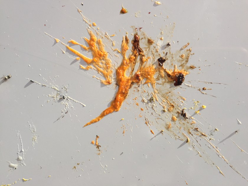 Is it art? A four inch Jackson Pollock? No! Bugs! At every stop we have a de-bugging activity. These were some of the biggest splats I have ever seen … and multicolored as well. We are very regular users of WaxWashAll, a product for cleaning and polishing the coach. A by product is that bugs come off easier. Good thing.