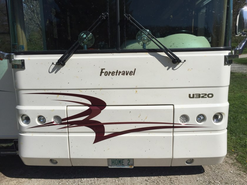 Is it art? A four inch Jackson Pollock? No! Bugs! At every stop we have a de-bugging activity. These were some of the biggest splats I have ever seen … and multicolored as well. We are very regular users of WaxWashAll, a product for cleaning and polishing the coach. A by product is that bugs come off easier. Good thing.