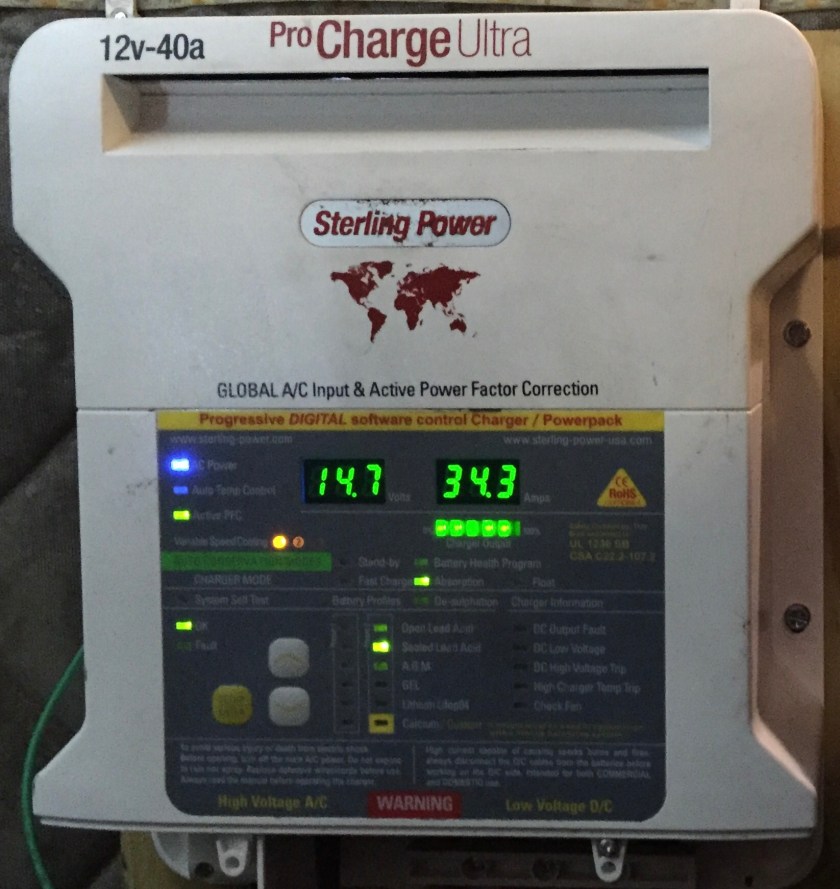 I also added a second battery charger. This was initially to charge the start battery when we were connected to shore power or had the generator running. I sized it so that it could also charge the second house battery set. At 40 amps it is sufficient but a bigger choice would have charged the second house batteries faster. It has a display that shows what the current battery voltage and charge rate are.