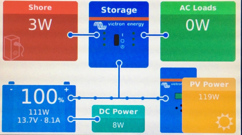 Typical CCGX display. The batteries are at 100%. The charger is idle. Solar is feeding 119 watts into the batteries. 8 watts are being consumed by 12 volt devices. 111 watts are maintaining the batteries at float. Only 2 watts are being consumed by the Multiplus in idle mode.