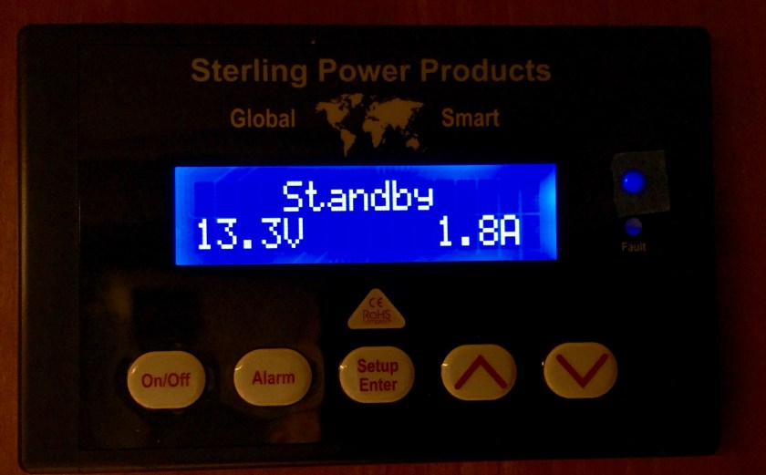 The charger display shows that the house 2 and start batteries are at 13.3 volts, a float level and being maintained with 1.8 amps into the seven batteries.