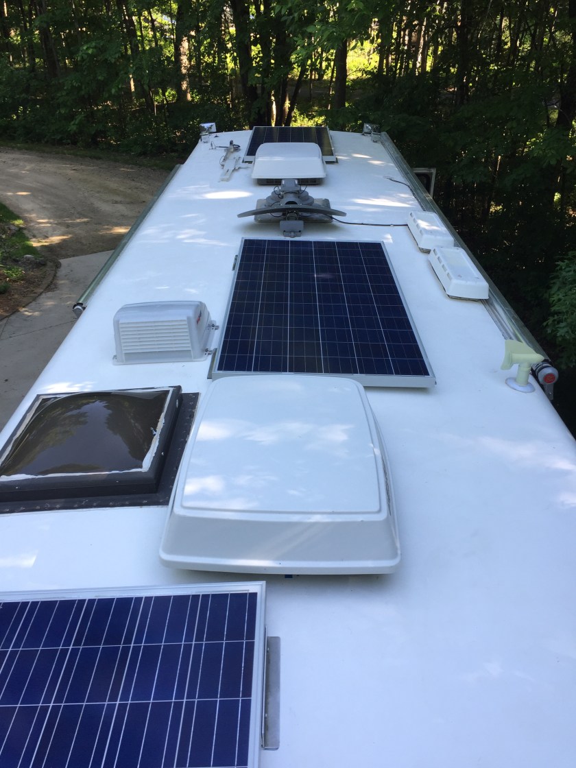Ideas were shaping up. I certainly didn't need ten panels so by the time we got home six had been sold. The plan was for three on our coach (if I never wanted to get on the roof again, there was maybe room for five) and one on the roof of the barn to keep batteries charged while the coach was inside. So 900 watts, a possibility of 65 amps of battery charging. The panels will never be perfectly aligned with the sun, there may be clouds or shade from trees. Almost anything can keep them from their maximum potential. But all of the wires, fuses, solar charge controller – everything – has to be sized for the maximum possible power. Realistically over time a days worth of power from the sun will be about 2700 watts going into the batteries or about 210 amp hours. Our refrigerator is the biggest power consumer, an average of 70 watts per hour or about 1850 watts for the day accounting for some inefficiencies in the 12 volt DC to 120 volt AC process. So on average we would be close to self sufficient just from the sun if we are careful with power usage. In practice we probably use a little more. The solar just means we can go for three or four days before we need to run our generator for a couple hours to make up any shortages.