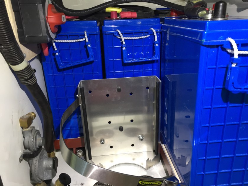 The Fullriver batteries came from AAA Battery in NE Minneapolis. I picked them up and got 10% off plus a credit for recycling old batteries. In the end it was the cheapest I could find for these batteries anywhere. The batteries got test fit on the rack in the shop. Perfect. The rack got installed with the original bolts that went through the basement floor steel frame. I made bigger plates to fit on the under side of the floor and loaded the plate and bolt hole with a 3M 5200 adhesive sealant and bolted it all together. It should be water tight for ever.
