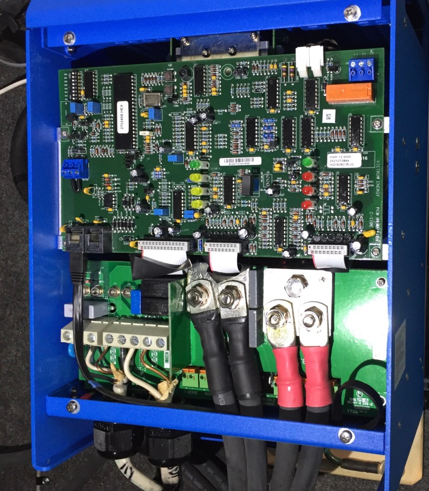 With the cover off the MultiPlus was very easy to work on. All of the connections are in front. You can see the two positive and two negative cables, each with its own connection point.
