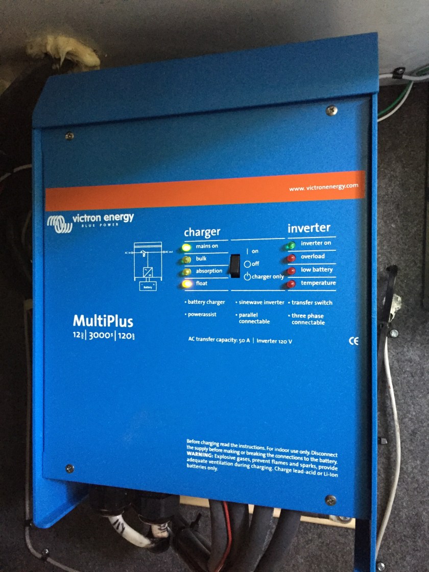 The MultiPlus has a built in transfer switch. When land line power or generator is available that power is sent to the coach. When it is not the inverter makes 120 V AC from 12 V DC and passes it to the coach. I elected to use the existing transfer switch in the coach. The way it is wired when the land line is connected or the generator is running up to 50 amps is available on the circuits that are powered by either the land line or the generator or the inverter. When there is no land line or generator power then it switches and uses the output from the inverter to power these circuits. The MultiPlus will transfer switch 50 amps as well but I would have had to run much bigger 120 volt wiring. Another choice.