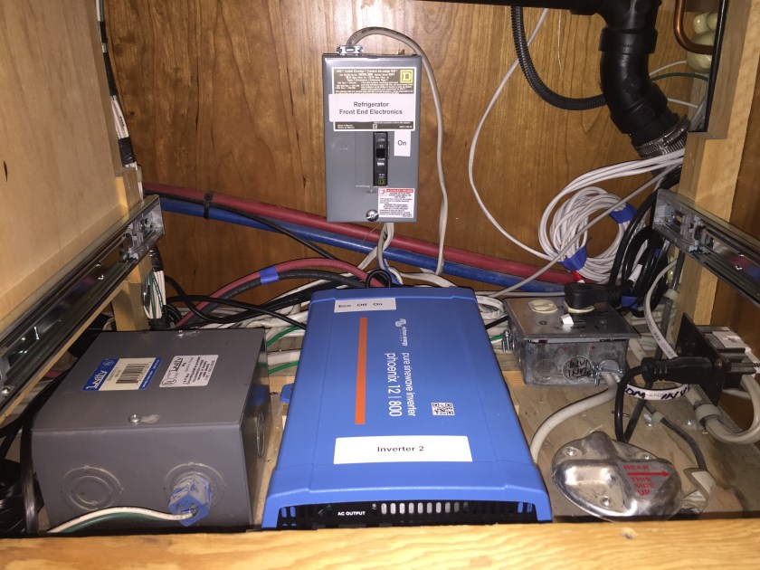 - A new house battery bank, wiring so that they can get charged, switches and fuses and wiring to a high efficiency inverter (change 12 volts DC to 120 volts AC) for the refrigerator circuit.