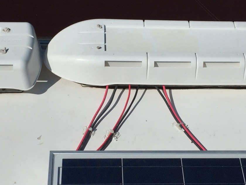 The panels are 24 volts each. A pair of wires (+/-) comes from each panel along the roof hidden and protected as much as possible. I used plastic wire tie attachments stuck to the roof with double sided tape. The solar cables are zip tied to these. It makes for a pretty tidy end result. The solar cables are run through water tight grommets in the side of the refrigerator vent and down into the refrigerator bay behind the refrigerator.