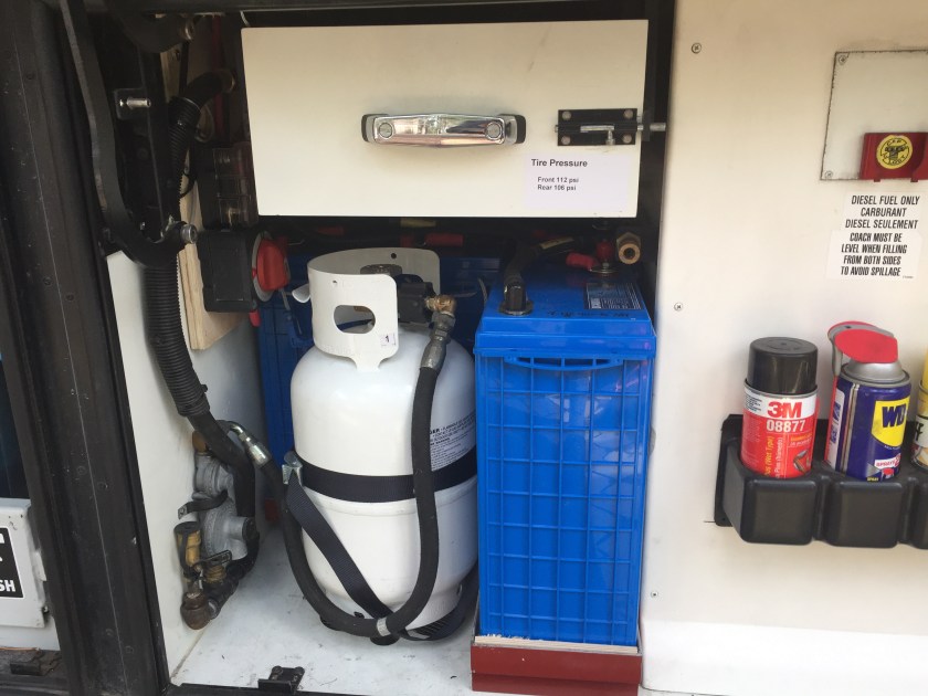 The three coach batteries now are Lifeline 8Ds. These are big (10"x22"x11" high) and heavy (167 lbs). There is room for three of these on two levels on the driver's side. On the other side where the big LP tank is there is the same footprint but not enough height for two levels. So the big LP tank was removed. I had it sold to a fellow in TX but there is no reasonable way to ship a used LP tank. It is considered a hazardous shipment. So that deal fell through.