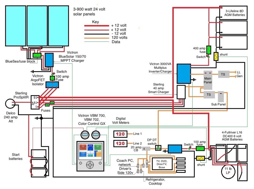 This gives us maximum flexibility in managing power use and distribution. Perhaps a bit of overkill but it works for us especially when we are in one place for a while and are only using solar and battery power.