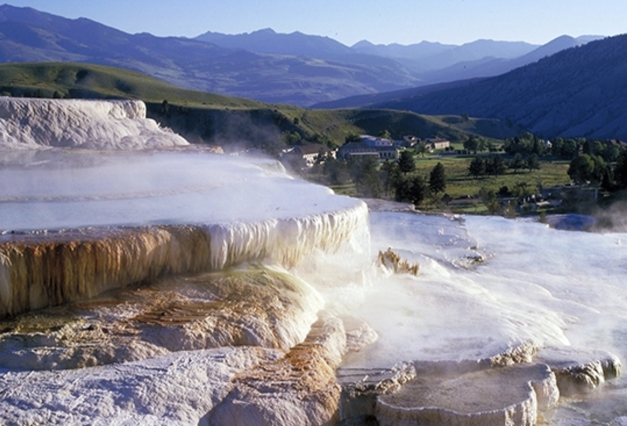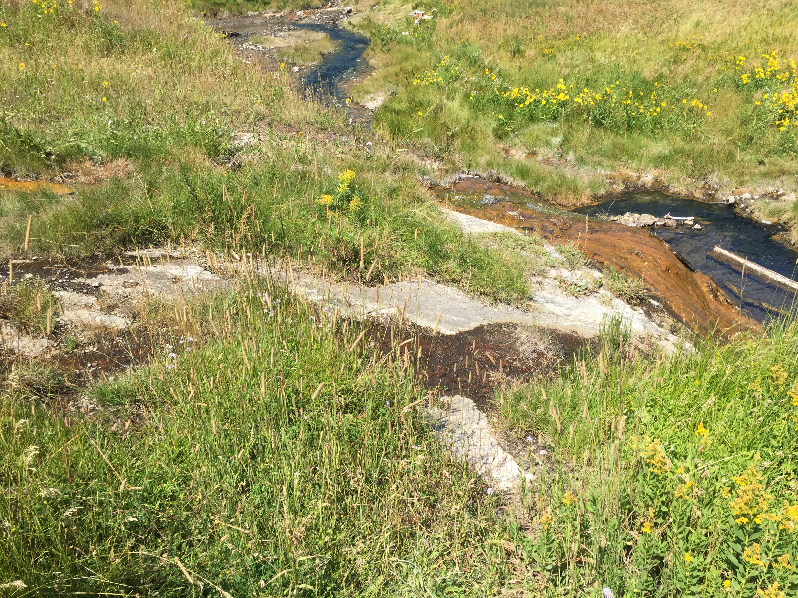 The Hot Springs are an entire meadow of oozing, hot smelly water which collects in small streams. People used to come up here to sit in the pools which at times are bigger. Signs now warn to stay out of the water because of the high temperatures (up to 180°), the nasty chemicals in the water and worse, the bacteria that grow in the water. Since this all flows down into the Polecat Creek maybe that is why there are not as many fish there.