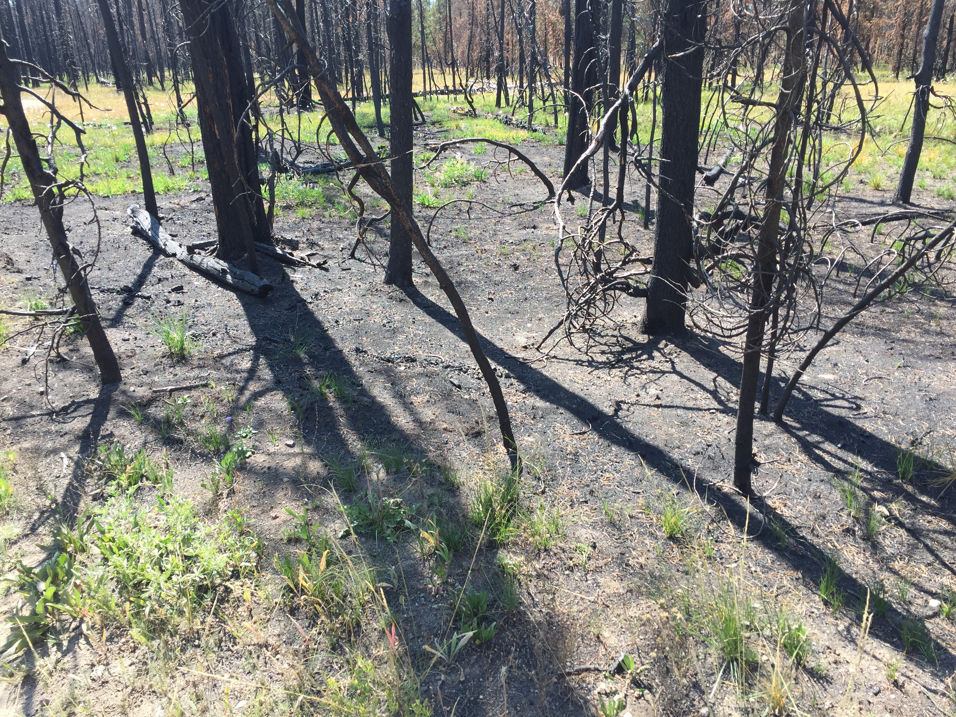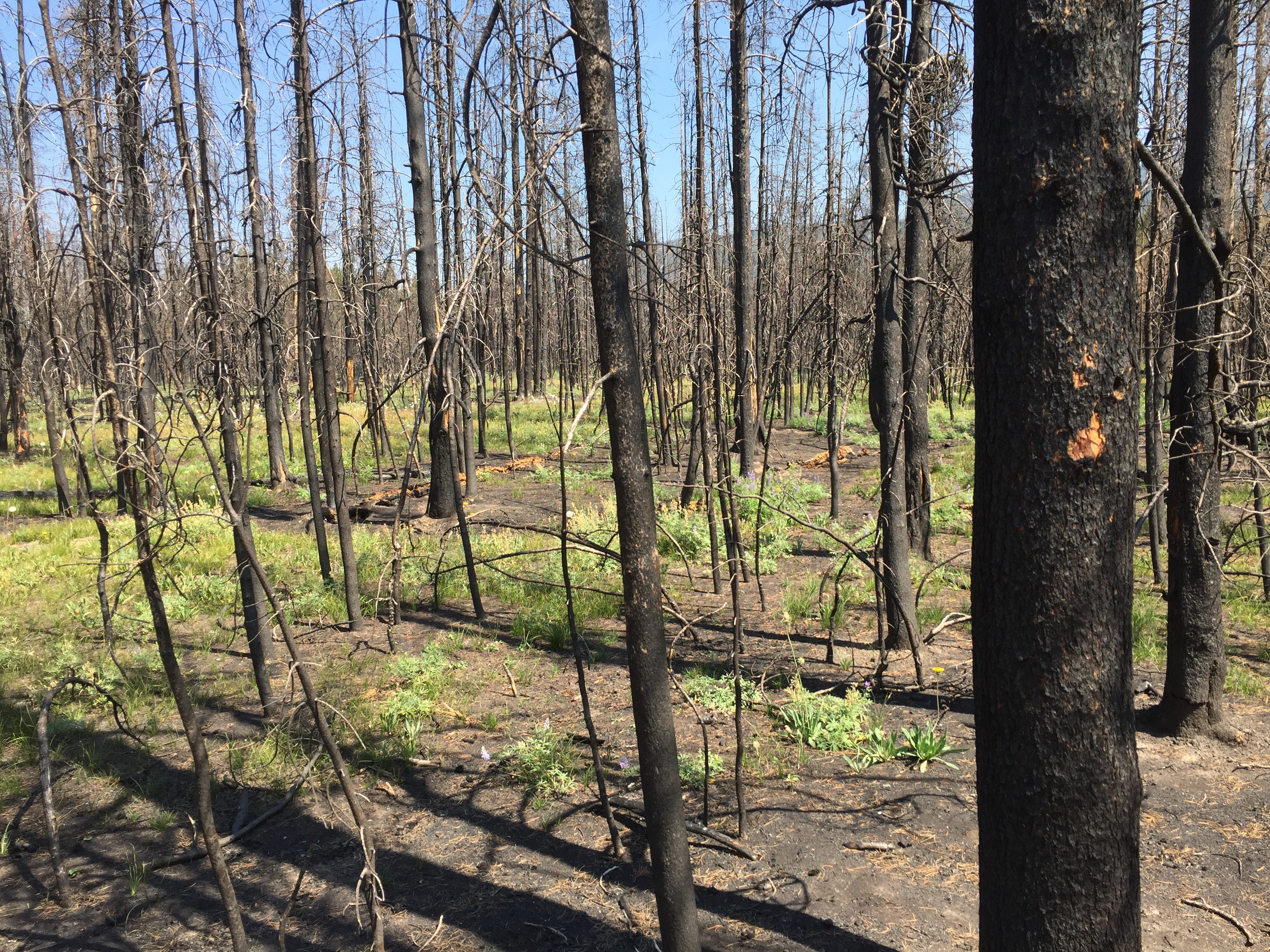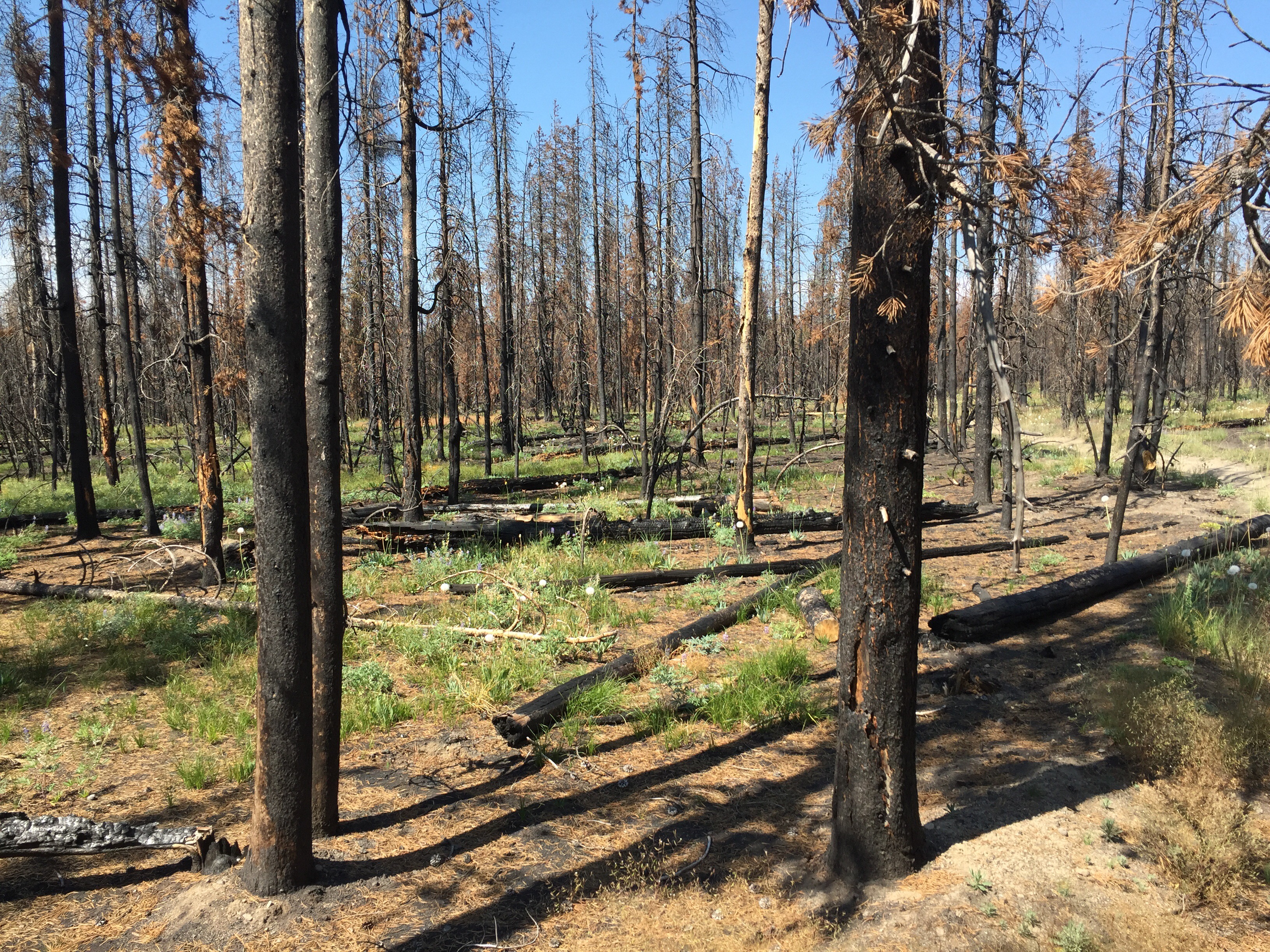 Even after a year the woods still smelled strongly of burned wood. In most places the fires moved through quickly burning everything on the ground and the trees. Not long enough to completely burn the trees, just long enough to kill them and leave them standing. The grasses and ground cover seem to be coming back in many areas. In areas where it was particularly hot they take longer.