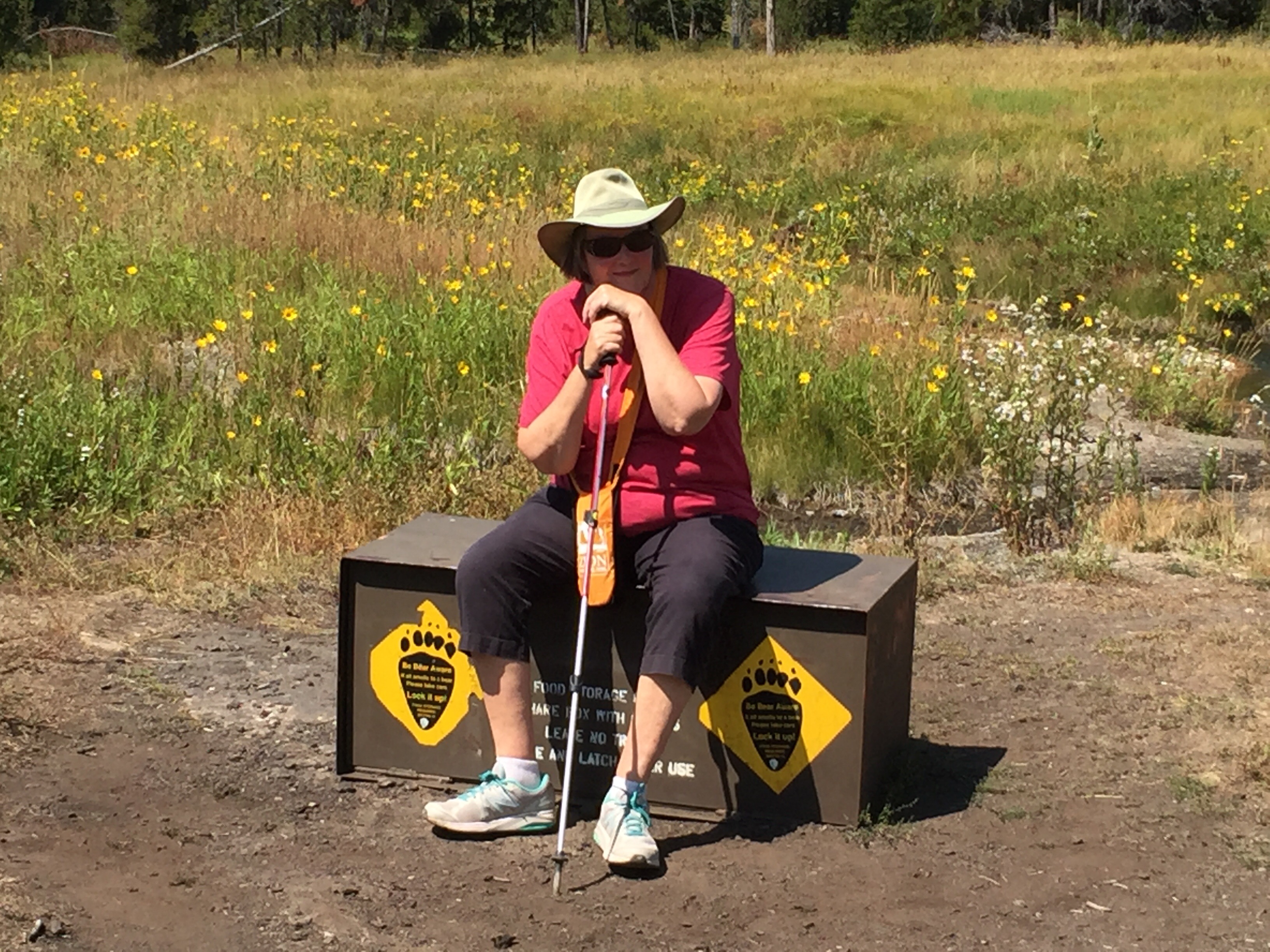 There is always time for a sit-down break, even if it is on a food storage box where the bears come looking for a snack. Hiking pole at the ready, just in case.
