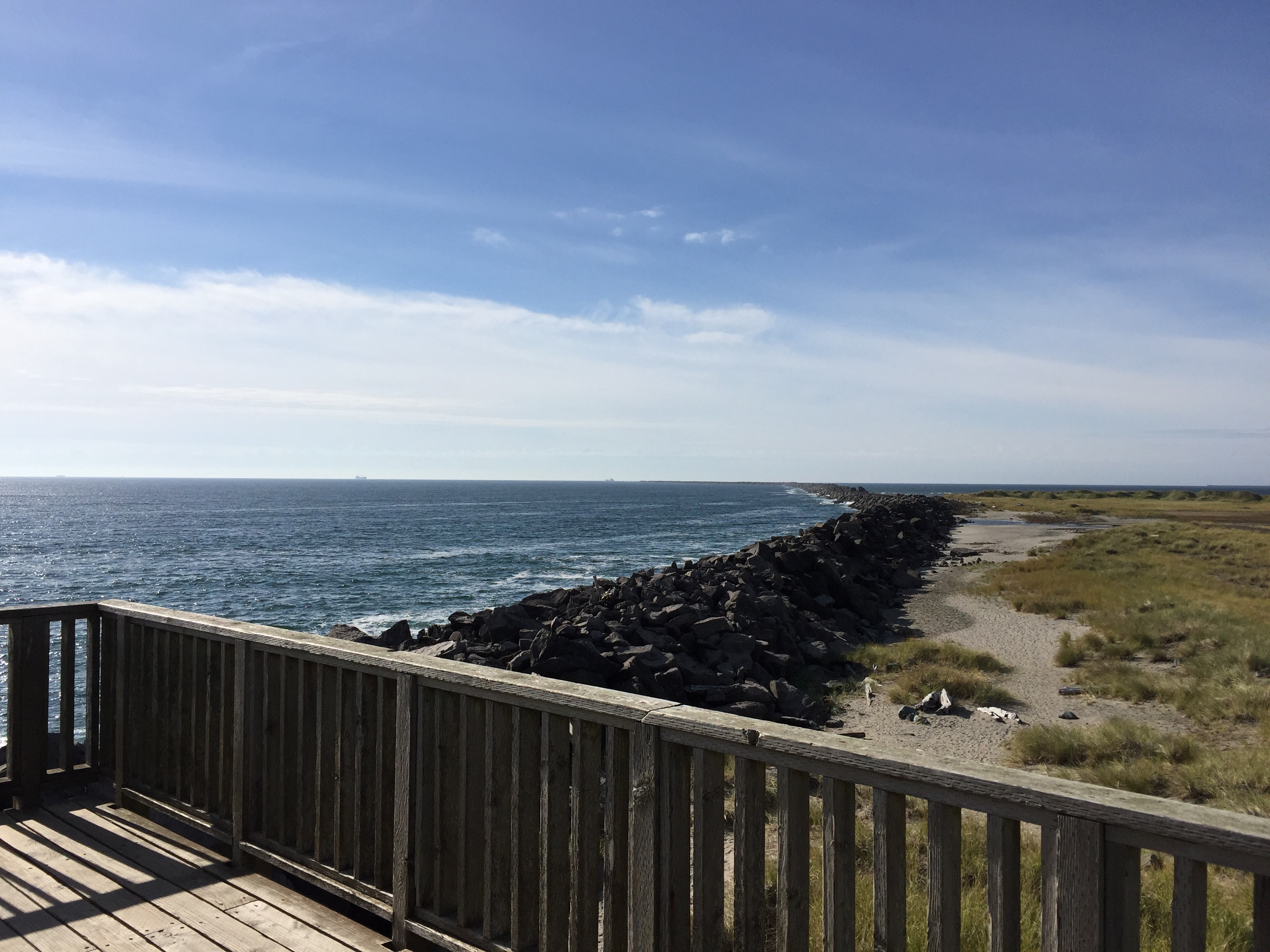 Starting in 1885 the Army Corp of Engineers began building a railroad trestle across a bay and across the end of the peninsula and out eventually 4-1/2 miles into the ocean. And then trains began hauling huge rocks out along the tracks dumping their loads further and further out, millions and millions of tons of rock. The jetties – there is one on the north side as well – took 27 years to build and was finished for just 55% of the original budget.