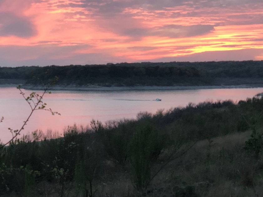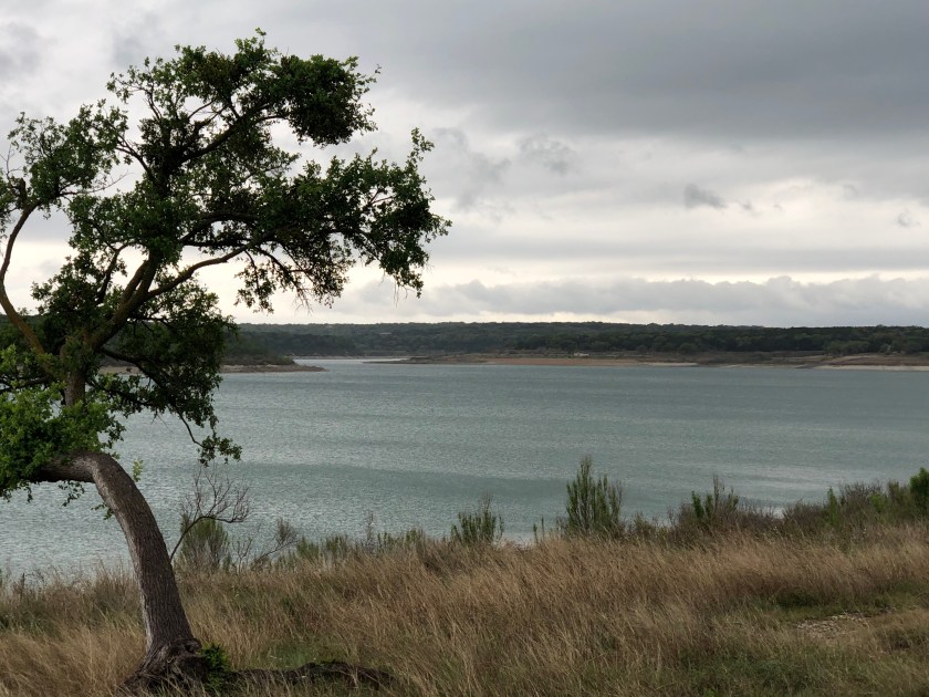 We drove across the northern part of the Texas Hill country from Onalaska (a small town) to Georgetown (a bigger town). We went around the top of Georgetown to Lake Georgetown which is behind a dam on the North Fork of the San Gabriel River just north and west of Georgetown. It is an Army Corps of Engineers dam. As is often the case there are campgrounds (3) and boat launch ramps on the lake. It is a much smaller lake than Lake Livingston and looking at the shoreline the water level is down quite a bit from normal.