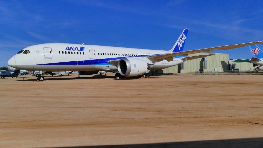 And here is a Boeing 787-8 Dreamliner! It is one of the first built as test aircraft. Serial number ZA002. It has hundreds of miles of cables and instrumentation installed and was never intended as a passenger model. Boeing donated it to the Pima Air & Space Museum in 2015. This is the only one of these I have seen.