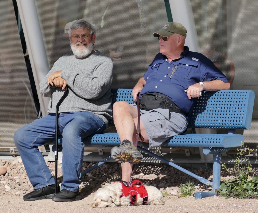 George on the left and Scott are waiting for the shuttle that takes us around the out door displays. Harley is Scott’s service dog. He has the waiting part handled pretty well.