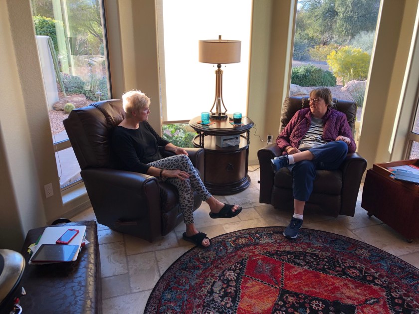 We went over to Frank and Pattie‘s home in Rio Verde for dinner and laundry. Frank is Susan’s brother. They spend half of their time in AZ and half in MN. Soon maybe a bit more in AZ. Frank and I were busy talking about Verizon vs AT&T. Susan and Pattie were busy chatting about dinner things.