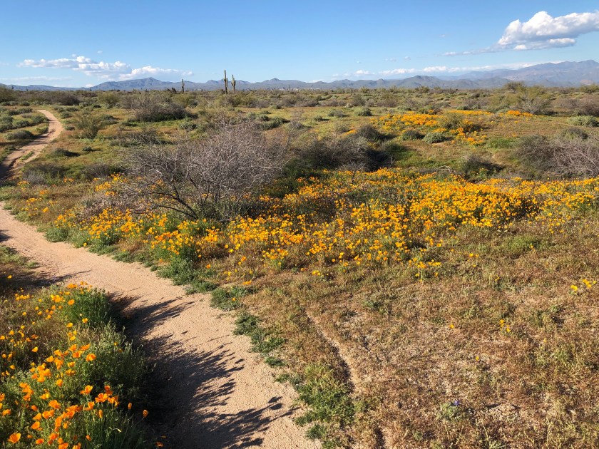 This year at McDowell we have seen the plant life become more invigorated and green. The desert here actually looks green right now. The grasses and bushes are green. The cacti are full and plump with water. All along the road sides are blue lupine plants that remind us of the Texas Hill Country Blue Bonnets. And a week and a half ago just a few hundred feet higher elevation the gold-yellow poppies burst out.