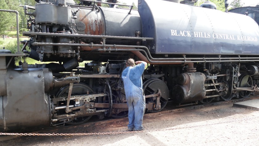 The train was made up of old restored cars. Maybe not something we would want to ride across country in but it was fun. The train followed old tracks over a couple big hills and through the woods to Hill City. There was a short stop where the steam engine uncoupled from the train and went to the other end of the trains and reconnected. Once they were all set we went back the same way.