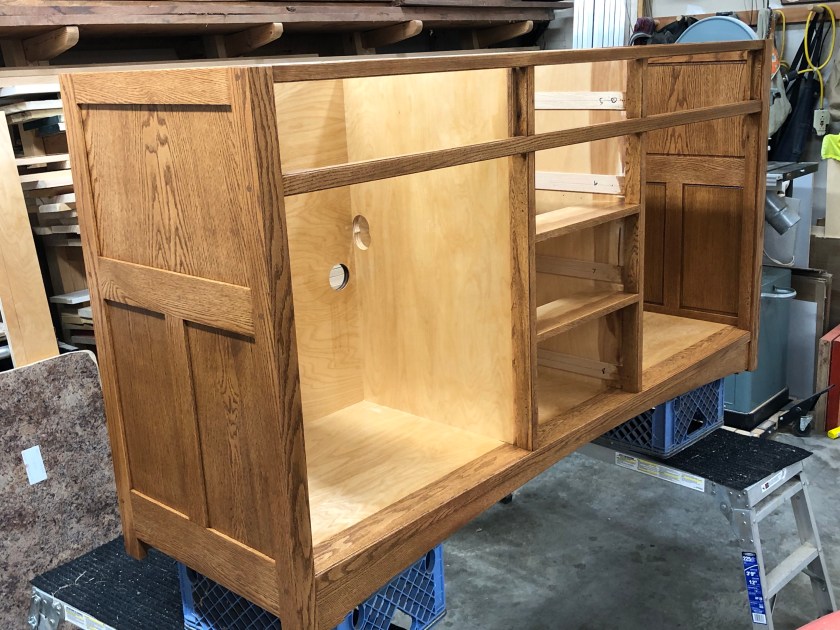 I sorted through wood, made selections, and started cutting. A couple weeks later, a cabinet with four doors and four drawers was ready for finish. Craftsman style with influences from Stickley and Greene and Greene.