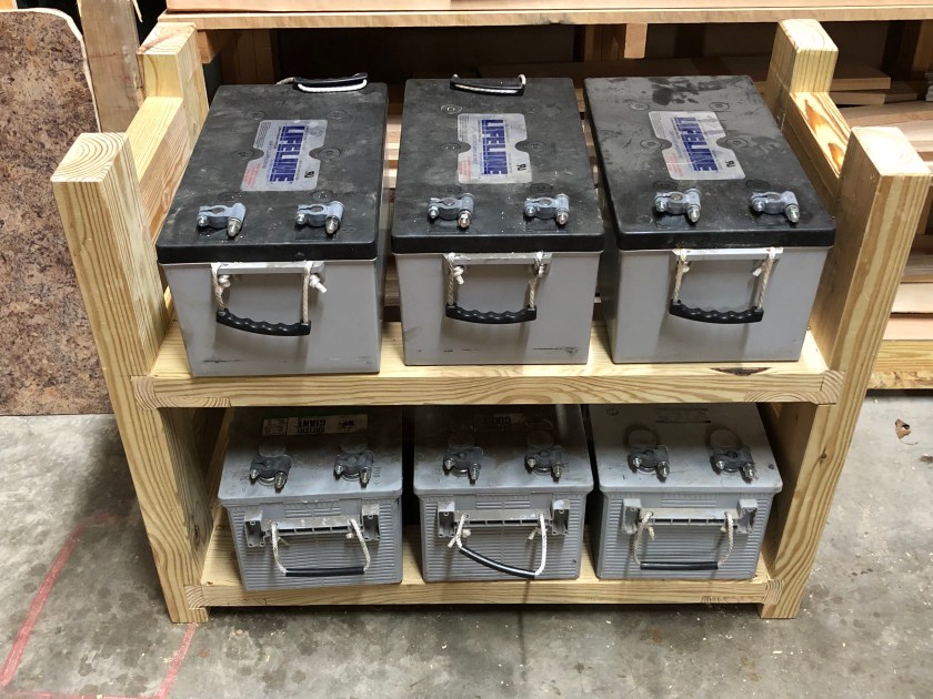 I hate throwing things away. Blame it on my Dad. I had the three batteries we removed from our coach, two batteries from Ted’s coach and an original battery from our coach from 2001. All charged up OK and held a charge. Their capacities were not quite what they were when new but still good enough for storing power.