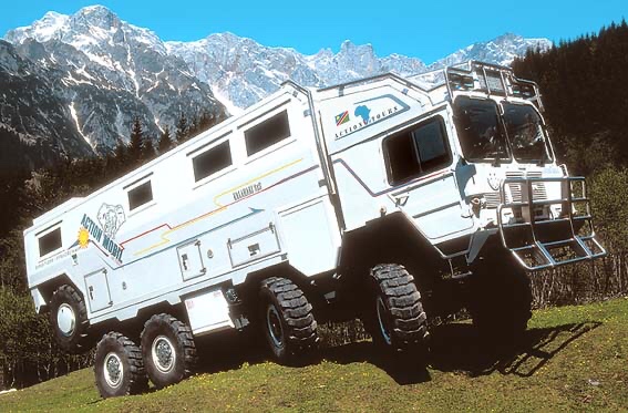 A GlobalX Vehicle. An off road monster with a vertical slide, bedroom was on the second floor. I talked to the owner, they had just picked it up and were on a shake down trip. My guess is that with those giant tires and suspension there was indeed some shakin’ goin’ on. He said maximum speed was 58 mph but it drove OK. Probably have a ladder stored somewhere for getting the bicycle down. And a fork lift to get the spare tire off.