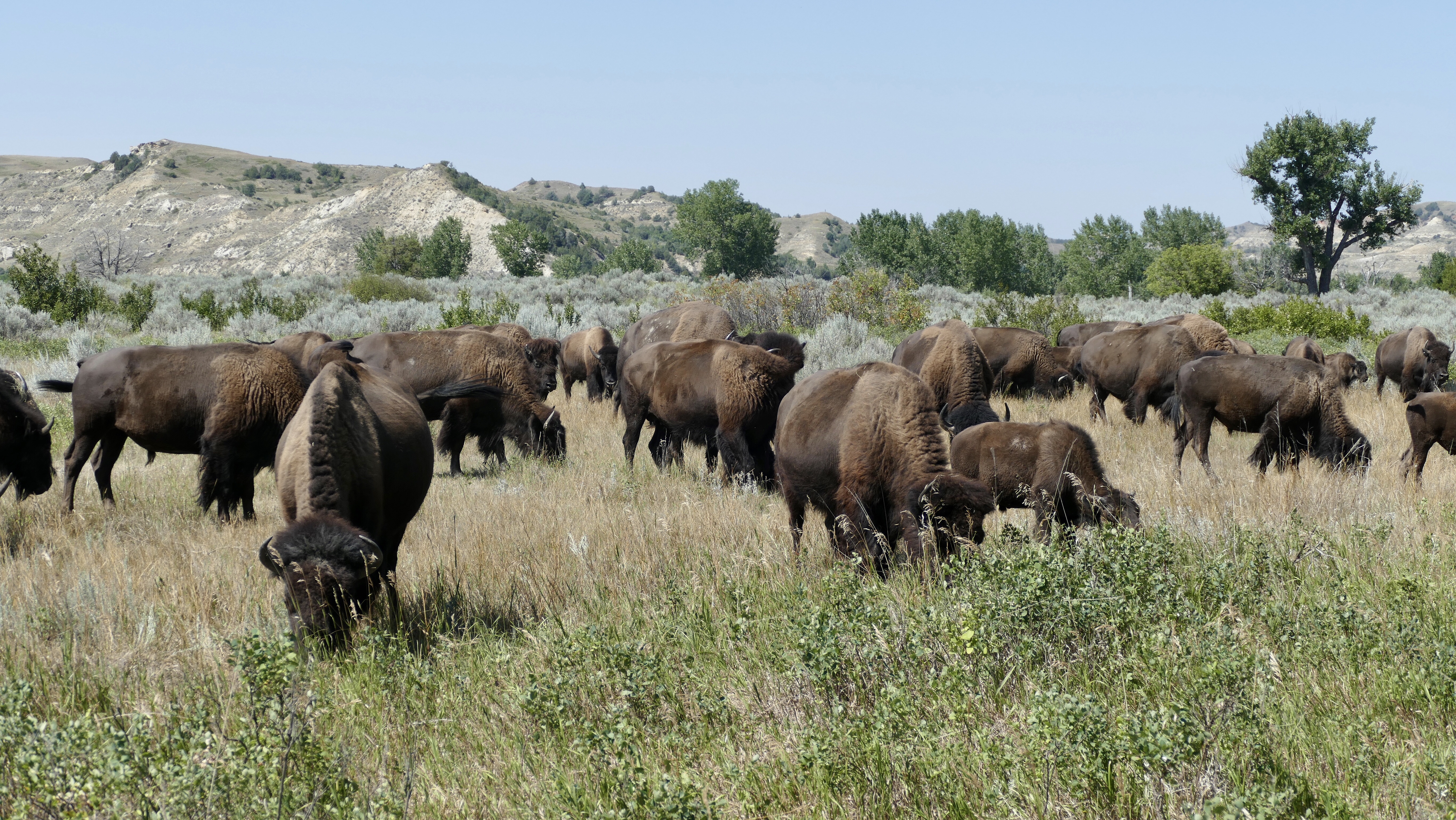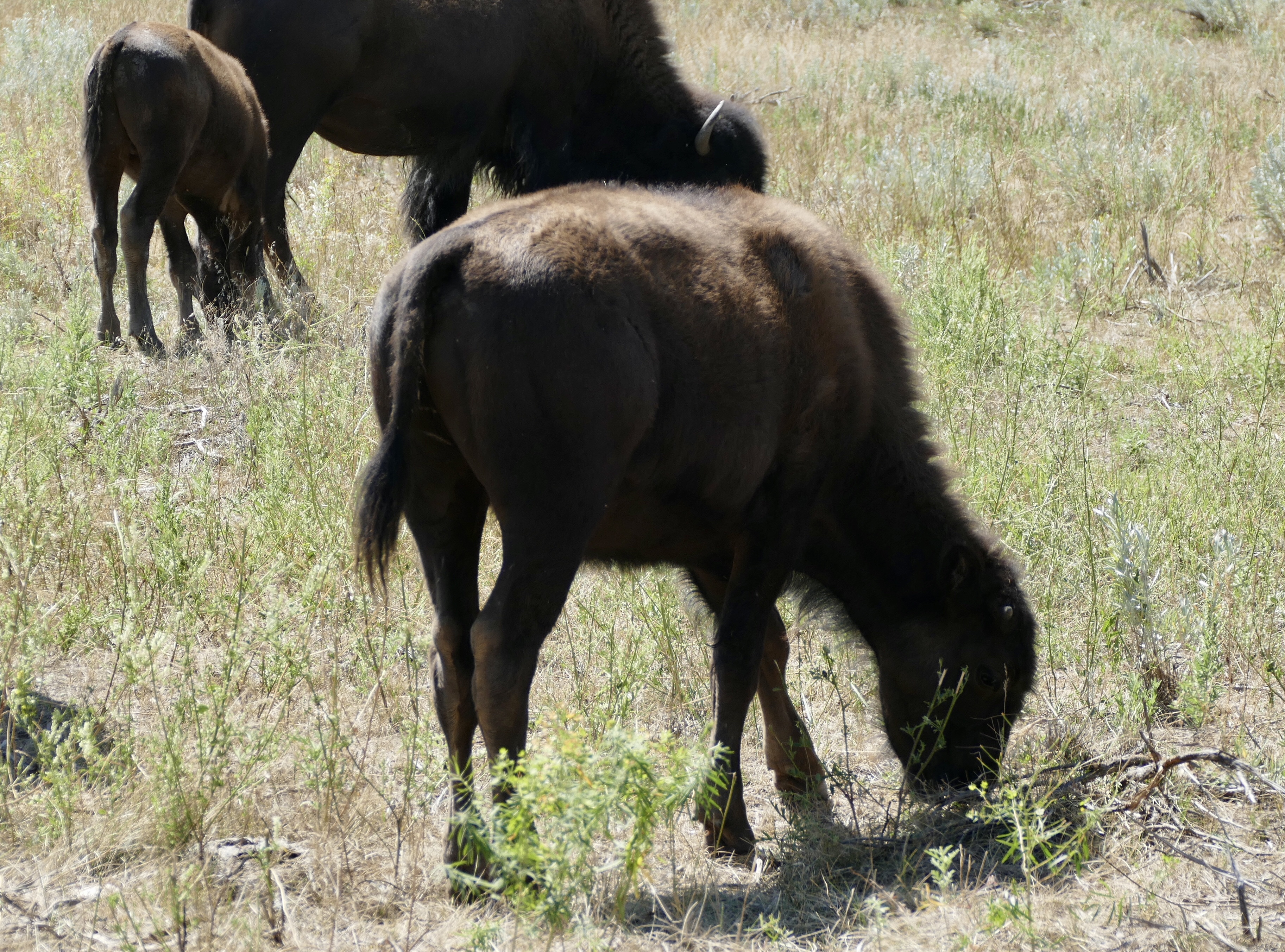 We saw a deer and then nothing for the first 25 miles and then a small group of bison near a creek. We stopped to see the site of an underground coal seam fire that burned from 1955 to 1977. And then drove on with the goal of the picnic area near the closed campground. Just before we got there we found another bigger herd of bison, lots of cows and calves. They were right along the side of the road so we were very cautious, stayed in the car and let them make the first move. They seemed not tame by any means but not unfamiliar with cars too. If a car moved they just moved the other way, calves following closely.