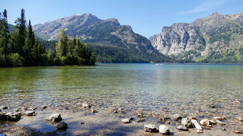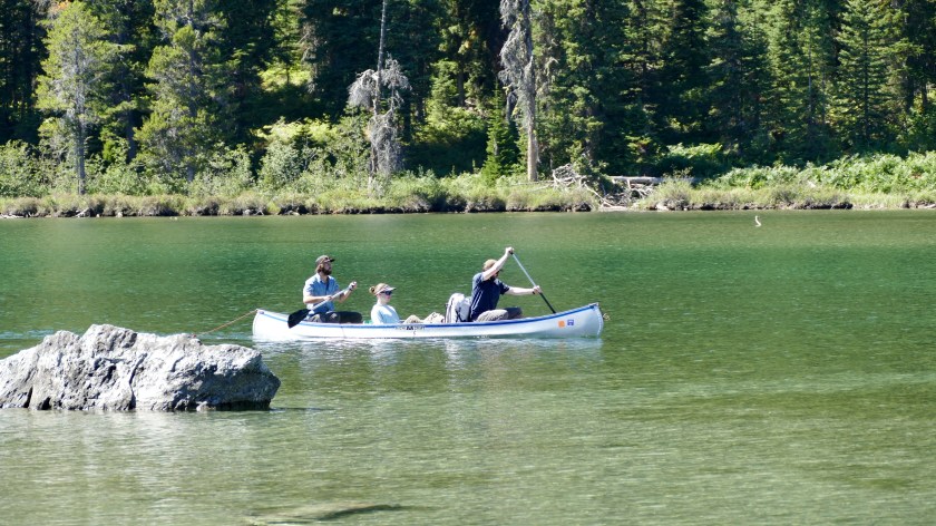 There are two high mountain lakes on the eastern side of the National Park, Two Ocean Lake and Emma Matilda Lake. You get there by following a dirt road several miles up into the mountains to a small parking area. There is a picnic area, trailheads leading every which way and a rugged path down to Two Ocean Lake to launch a canoe or kayak. No motors allowed.
