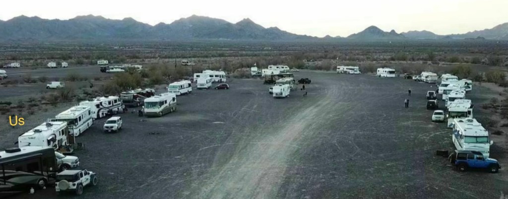 We have been hearing about the giant RV show and gathering of hundreds of thousands of RVs at the tiny town of Quartzsite Arizona on I10 just east of the California Border for many years. There are quite a few RV parks there for those spending the winter or for many who come with an off-road vehicle to drive in the open desert in the area. Getting one of the limited spaces to park your RV is limited to those who make reservations a long time in advance. The urban legend says that 750,000 of every type of RV show up and just park anywhere they want in the desert, mostly south of Quartzsite. It is true. RVs are parked for miles south of town. The count might not be RVs but campers (people).