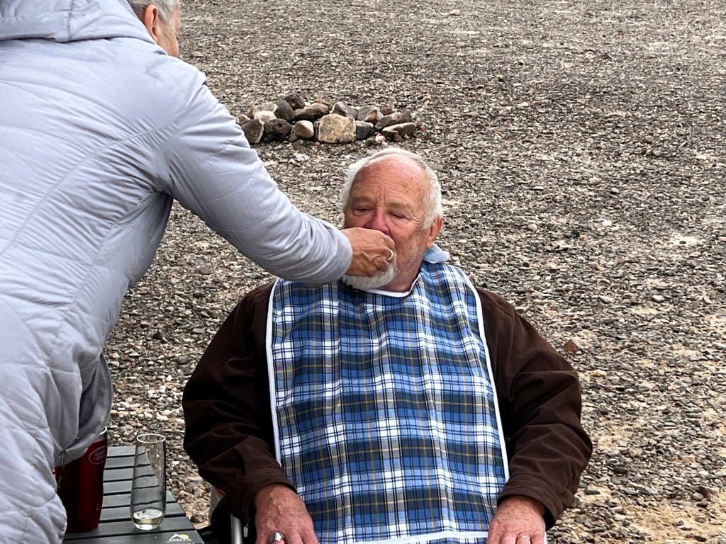 One day was Han’s Birthday. We made a carrot cake for all to share and in honor of Han’s entering into a senior level (mid-70s) of geezerdom we presented him with what all older folks need, a crumb-catching bib.