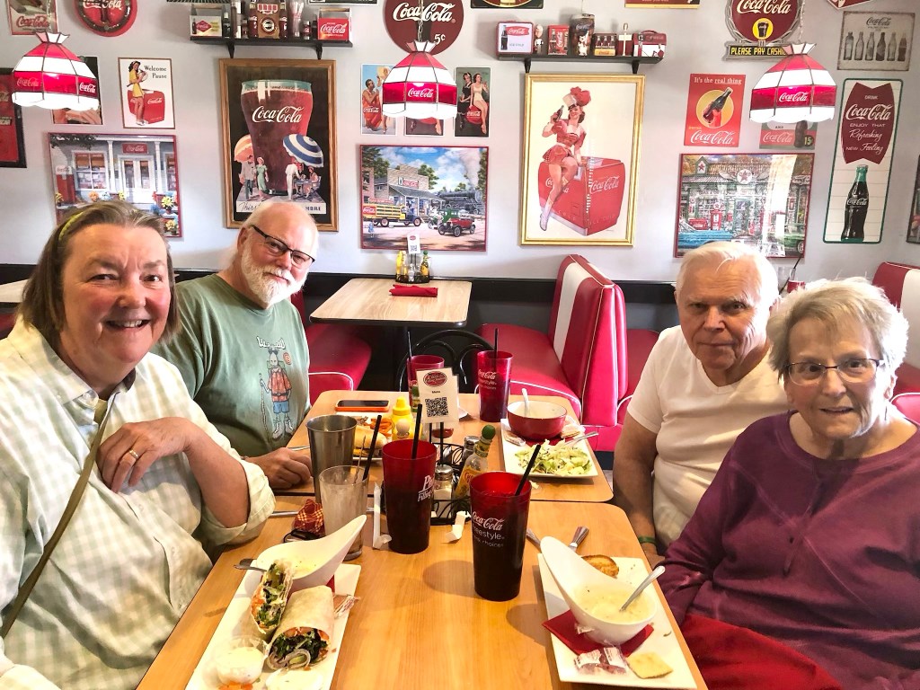 The restaurant was sort of an old-time diner-themed place with lots of Coke memorabilia. Fifty’s music too.