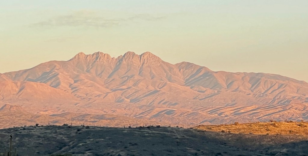 In the morning the hills and mountains to the south look like layered cardboard cutouts of different shades of gray. This is a common desert appearance.