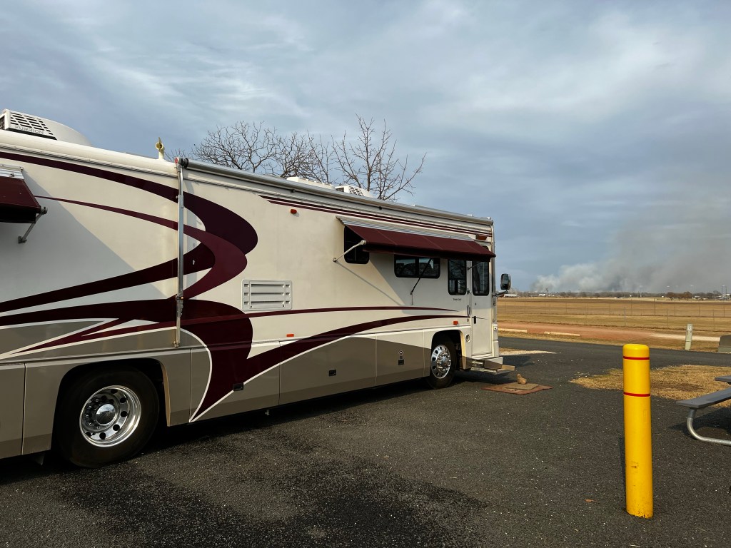 Runway right in front of us. This particular day there was a grass fire not too far away, lots of white smoke for a while.